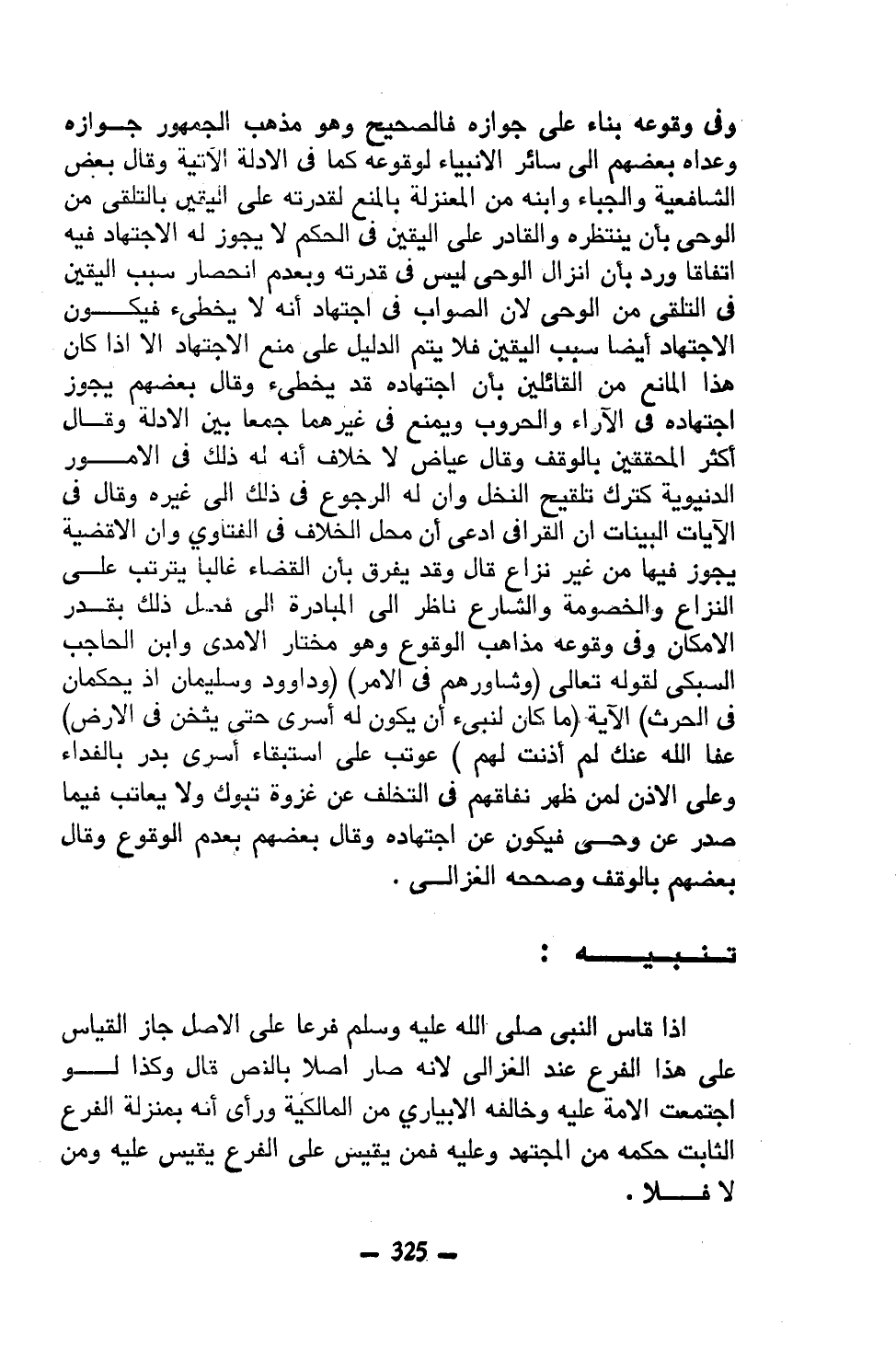 وفي وقوعه بناء على جوازه فالصحيح وهو مذهب الجمهور جوازه وعداه بعضهم إلى سائر الأنبياء لوقوعه كما في الأدلة الآتية وقال بعض الشافعية والجباء وأبنه من المعنزلة بالمنع لقدرته على اليقين بالتلقي من الوحي بأن ينتظره والقادر على اليقين في الحكم لا يجوز له الاجتهاد فيه اتفاقًا ورد بأن إنزال الوحي ليس في قدرته وبعدم انحصار سبب اليقين في التلقي من الوحي لأن الصواب في اجتهاد أنه لا يخطئ فيكون الاجتهاد أيضًا سبب اليقين فلا يتم الدليل على منع الاجتهاد إلا إذا كان هذا المانع من القائلين بأن اجتهاده قد يخطئ وقال بعضهم يجوز اجتهاده في الآراء والحروب ويمنع في غيرهما جمعًا بين الأدلة وقال أكثر المحققين بالوقف وقال عياض لا خلاف أنه له ذلك في الأمور الدنيوية كترك تلقيح النخل وأن له الرجوع في ذلك إلى غيره وقال في الآيات البينات أن القرافي أدعى أن محل الخلاف في الفتاوي وأن الأقضية يجوز فيها من غير نزاع قال وقد يفرق بأن القضاء غالبًا يترتب على النزاع والخصومة والشارع ناظر إلى المبادرة إلى فصل ذلك بقدر الإمكان وفي وقوعه مذاهب الوقوع وهو مختار الأمدي وأبن الحاجب السبكي لقوله تعالى ((وشاورهم في الأمر)) ((وداوود وسليمان إذ يحكمان في الحرث)) الآية ((ما كان لنبيء أن يكون له أسرى حتى يثخن في الأرض)) ((عفا الله عنك لم أذنت لهم)) عوتب على استبقاء أسرى بدر بالفداء وعلى الإذن لمن ظهر نفاقهم في التخلف عن غزوة تبوك ولا يعاتب فيما صدر عن وحي فيكون عن اجتهاده وقال بعضهم بعدم الوقوع وقال بعضهم بالوقف وصححه الغزالي.