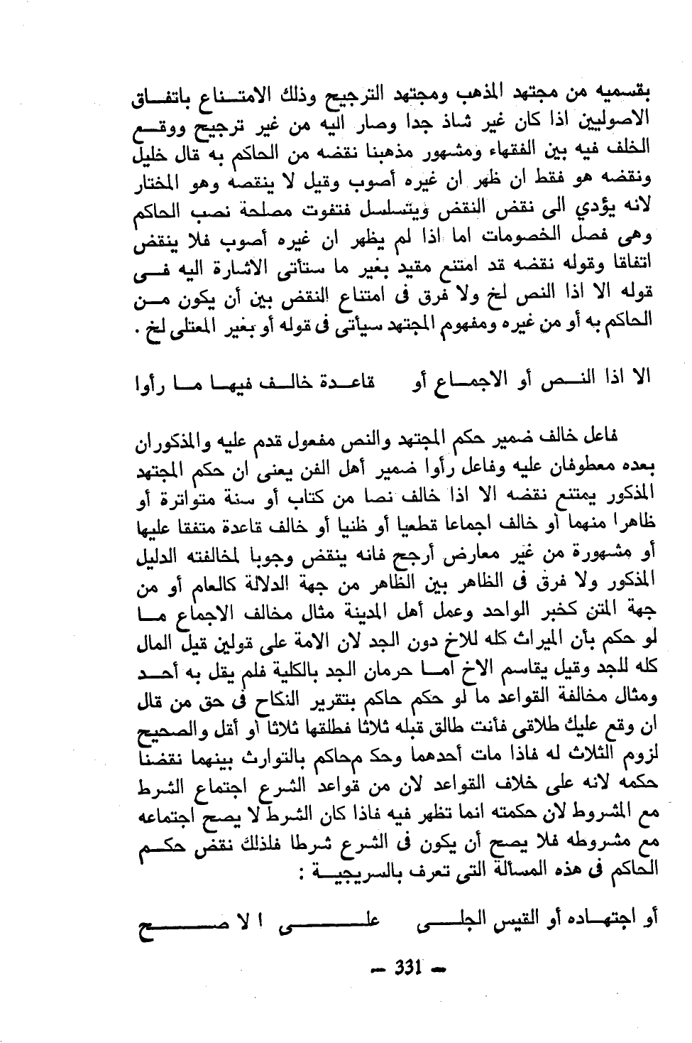 بقسميه من مجتهد المذهب ومجتهد الترجيح وذلك الامتناع باتفاق الأصوليين إذا كان غير شاذ جدًا وصار إليه من غير ترجيح ووقع الخلف فيه بين الفقهاء ومشهور مذهبنا نقضه من الحاكم به قال خليل ونقضه هو فقط إن ظهر إن غيره أصوب وقيل لا ينقصه وهو المختار لأنه يؤدي إلى نقض النقض ويتسلسل فتفوت مصلحة نصب الحاكم وهي فصل الخصومات أما إذا لم يظهر أن غيره أصوب فلا ينقض اتفاقًا وقوله نقضه قد امتنع بغير ما ستأتي الإشارة إليه في قوله إلا إذا النص لخ ولا فرق في امتناع النقض بين أن يكون من الحاكم به أو من غيره ومفهوم المجتهد سيأتي في قوله أو بغير المعتلي لخ.