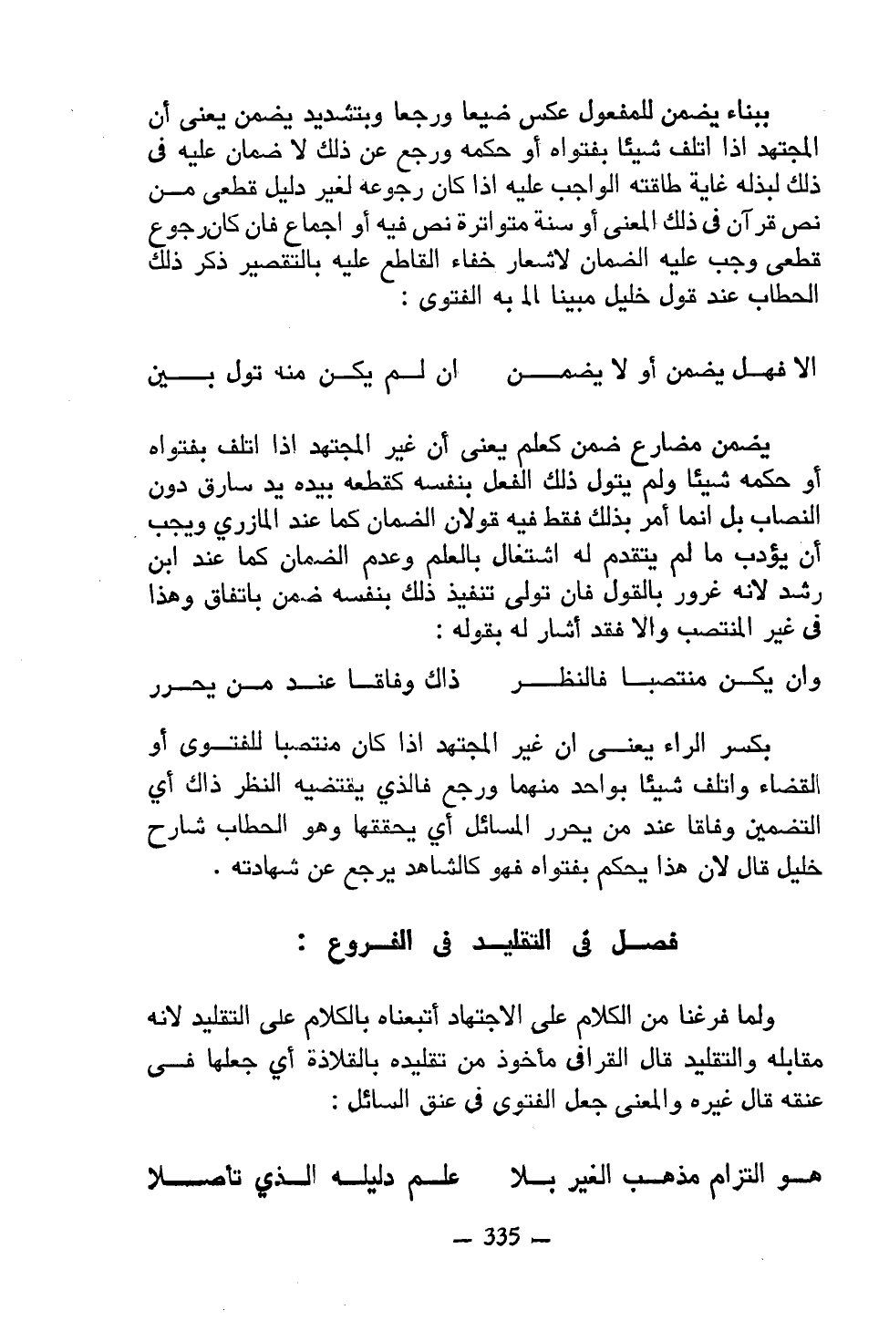 ببناء يضمن للمفعول عكس ضيعا ورجعا وبتشديد يضمن يعني أن المجتهد إذا اتلف شيئًا بفتواه أو حكمه ورجع عن ذلك لا ضمان عليه في ذلك لبذله غاية طاقته الواجب عليه إذا كان رجوعه لغير دليل قطعي من نص قرآن في ذلك المعنى أو سنة متواترة نص فيه أو إجماع فإن كان رجوع قطعي وجب عليه الضمان لأشعار خفاء القاطع عليه بالتقصير ذكر ذلك الحطاب عند قول خليل مبينًا المراد به الفتوى: