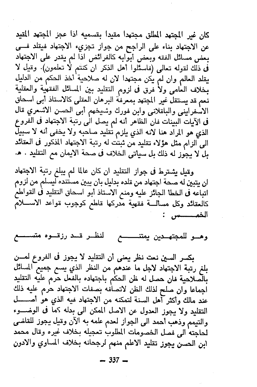 كان غير المجتهد المطلق مجتهدًا مقيدًا بقسميه إذا عجز المجتهد المقيد عن الاجتهاد بناء على الراجح من جواز تجزيء الاجتهاد فيقلد في بعض مسائل الفقه وبعض أبوابه كالفرائض إذا لم يقدر على الاجتهاد في ذلك لقوله تعالى ((فاسئلوا أهل الذكر إن كنتم لا تعلمون)). وقيل لا يقلد العالم وإن لم يكن مجتهدًا لأن له صلاحية أخذ الحكم من الدليل بخلاف العامي ولا فرق في لزوم التقليد بين المسائل الفقهية والعقلية نعم قد يستقل غير المجتهد بمعرفة البرهان العقلي كالأستاذ أبي إسحاق الأسفرايني والباقلاني وأبن فورك وشيخهم أبي الحسن الأشعري قال في الآيات البينات فإن الظاهر أنه لم يصل إلى رتبة الاجتهاد في الفروع الذي هو المراد هنا لأنه الذي يلزم تقليد صاحبه ولا يخفى أنه لا سبيل إلى إلزام مثل هؤلاء تقليد من ثبتت له رتبة الاجتهاد المذكور في العقائد بل لا يجوز له ذلك بل سيأتي الخلاف في صحة الإيمان مع التقليد. هـ.