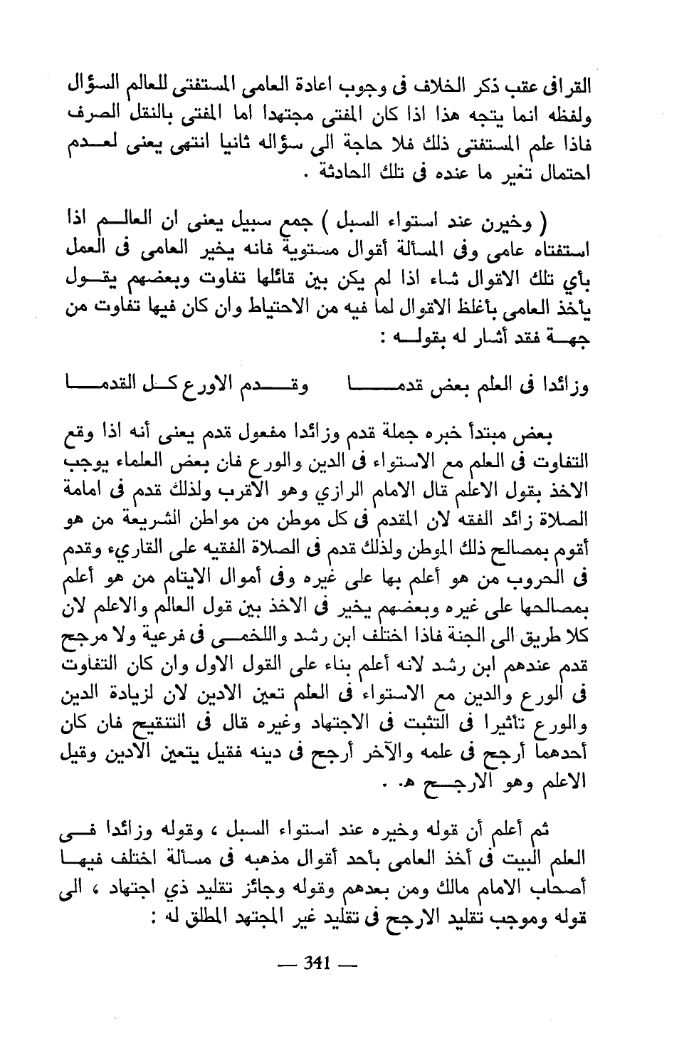 ثم أعلم أن قوله وخيره عند استواء السبل، وقوله وزائدًا في العلم البيت في أخذ العامي بأحد أقوال مذهبه في مسألة اختلف فيها أصحاب الإمام مالك ومن بعدهم وقوله وجائز تقليد ذي اجتهاد، إلى قوله وموجب تقليد الأرجح في تقليد غير المجتهد المطلق له: