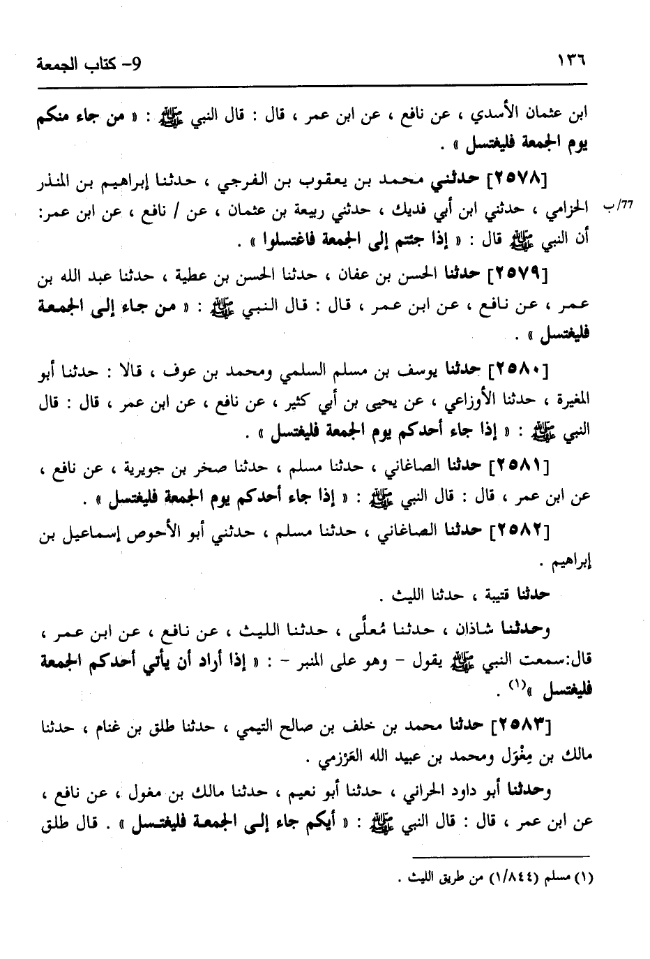 2582 - حَدَّثَنَا الصَّاغَانِيُّ، حَدَّثَنَا مُسْلِمٌ، حَدَّثَنِي أَبُو الْأَحْوَصِ إِسْمَاعِيلُ بْنُ إِبْرَاهِيمَ، حَدَّثَنَا قُتَيْبَةُ، حَدَّثَنَا اللَّيْثُ، وَحَدَّثَنَا شَاذَانُ، حَدَّثَنَا مُعَلَّى، حَدَّثَنَا اللَّيْثُ، عَنْ نَافِعٍ، عَنِ ابْنِ عُمَرَ قَالَ: سَمِعْتُ النَّبِيَّ صَلَّى اللهُ عَلَيْهِ وَسَلَّمَ يَقُولُ وَهُوَ عَلَى الْمِنْبَرِ: «§إِذَا أَرَادَ أَنْ يَأْتِيَ أَحَدُكُمُ الْجُمُعَةَ فَلْيَغْتَسِلْ»