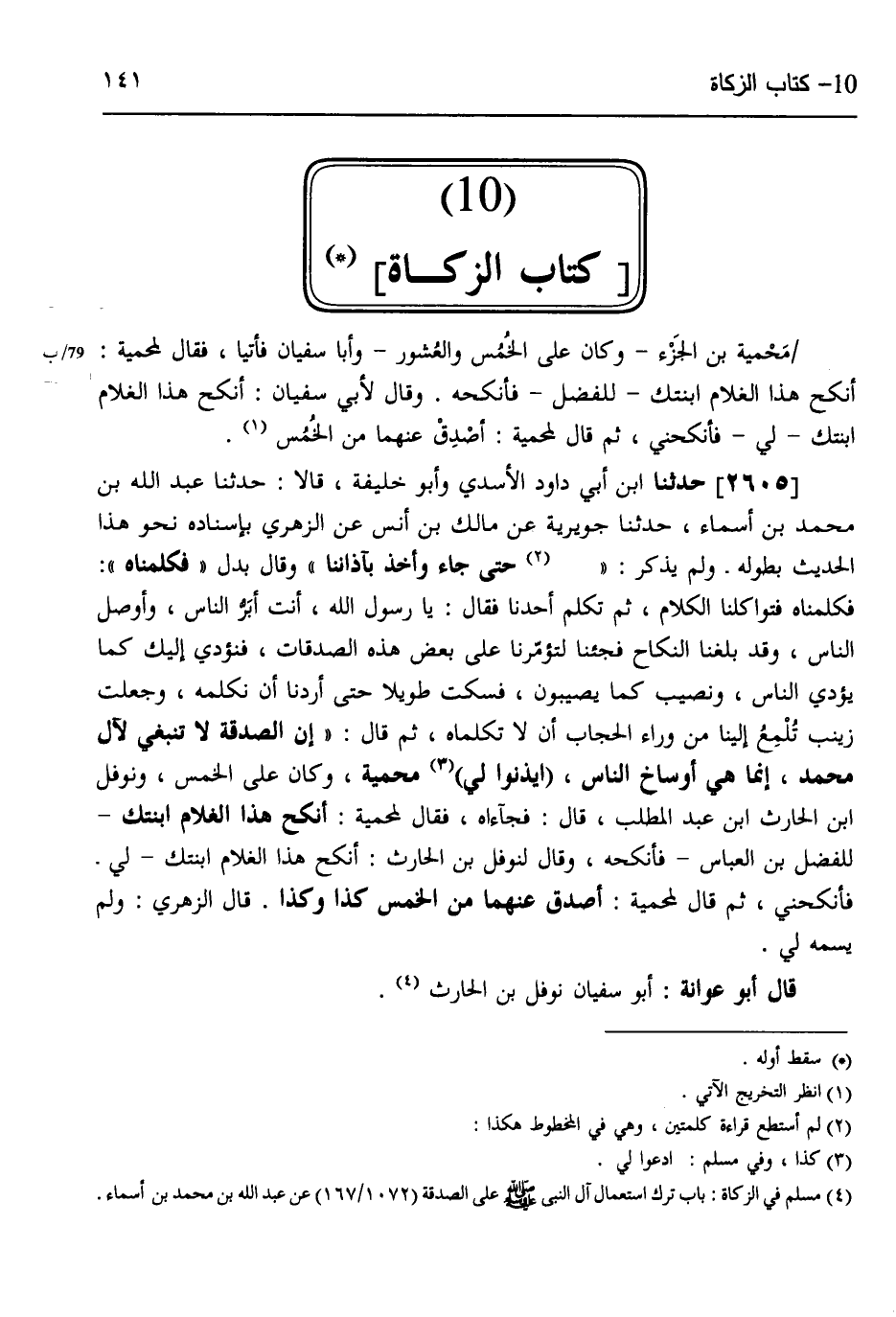 2605 - حَدَّثَنَا ابْنُ أَبِي دَاوُدَ الْأَسَدِيُّ، وَأَبُو خَلِيفَةَ، قَالَا: حَدَّثَنَا عَبْدُ اللَّهِ بْنُ مُحَمَّدِ بْنِ أَسْمَاءَ، حَدَّثَنَا جُوَيْرِيَةُ، عَنْ مَالِكِ بْنِ أَنَسٍ، عَنِ الزُّهْرِيِّ، بِإِسْنَادِهِ نَحْوَ هَذَا الْحَدِيثَ بِطُولِهِ وَلَمْ يَذْكُرْ. . .: حَتَّى جَاءَ وَأَخَذَ بِآذَانِنَا، وَقَالَ بَدَلٌ: فَكَلَّمْنَاهُ، فَكَلَّمْنَاهُ، فَتَوَاكَلْنَا الْكَلَامَ ثُمَّ تَكَلَّمَ أَحَدُنَا فَقَالَ: يَا رَسُولَ اللَّهِ، أَنْتَ أَبَرُّ النَّاسِ، وَأَوْصَلُ النَّاسِ، وَقَدْ بَلَغَنَا النِّكَاحُ فَجِئْنَا لِتُؤَمِّرَنَا عَلَى بَعْضِ هَذِهِ الصَّدَقَاتِ، فَنُؤَدِّيَ إِلَيْكَ كَمَا يُؤَدِّي النَّاسُ، وَنُصِيبُ كَمَا يُصِيبُونَ، فَسَكَتَ طَوِيلًا حَتَّى أَرَدْنَا أَنْ نُكَلِّمَهُ وَجَعَلَتْ زَيْنَبُ تُلْمِعُ إِلَيْنَا مِنْ وَرَاءِ الْحِجَابِ: أَنْ لَا تُكَلِّمَاهُ، ثُمَّ قَالَ: «إِنَّ §الصَّدَقَةَ لَا تَنْبَغِي لِآلِ مُحَمَّدٍ، إِنَّمَا هِيَ أَوْسَاخُ النَّاسِ، آذِنُوا لِي مَحْمِيَةً» - وَكَانَ عَلَى الْخُمُسِ وَنَوْفَلَ بْنَ الْحَارِثِ بْنِ عَبْدِ الْمُطَّلِبِ - قَالَ: فَجَاءَاهُ، فَقَالَ لِمَحْمِيَةَ: «أَنْكِحْ هَذَا الْغُلَامَ ابْنَتَكَ» لِلْفَضْلِ بْنِ الْعَبَّاسِ فَأَنْكَحَهُ، وَقَالَ لِنَوْفَلِ بْنِ الْحَارِثِ: «أَنْكِحْ هَذَا الْغُلَامَ ابْنَتَكَ» لِي، فَأَنْكَحَنِي ثُمَّ قَالَ لِمَحْمِيَةَ: «أَصْدِقْ عَنْهُمَا مِنَ الْخُمُسِ كَذَا وَكَذَا» ، قَالَ الزُّهْرِيُّ: وَلَمْ يُسَمِّهِ لِي، قَالَ أَبُو عَوَانَةَ: أَبُو سُفْيَانَ نَوْفَلُ بْنُ الْحَارِثِ