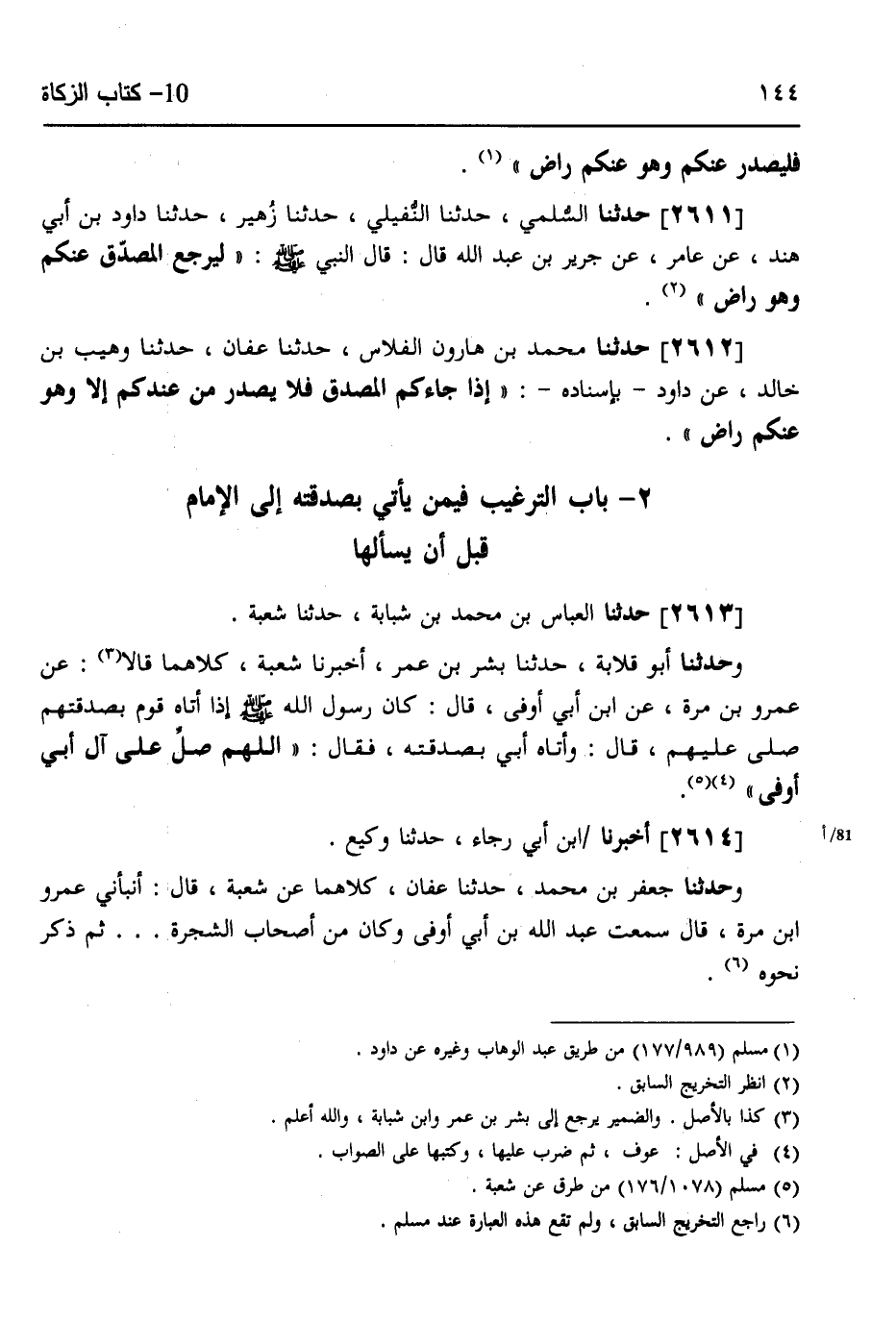 2611 - حَدَّثَنَا السُّلَمِيُّ، حَدَّثَنَا النُّفَيْلِيُّ، حَدَّثَنَا زُهَيْرٌ، حَدَّثَنَا دَاوُدُ بْنُ أَبِي هِنْدَ، عَنْ عَامِرٍ،، عَنْ جَرِيرِ بْنِ عَبْدِ اللَّهِ قَالَ: قَالَ النَّبِيُّ صَلَّى اللهُ عَلَيْهِ وَسَلَّمَ: «§لِيَرْجِعِ الْمُصَدِّقُ عَنْكُمْ وَهُوَ رَاضٍ»