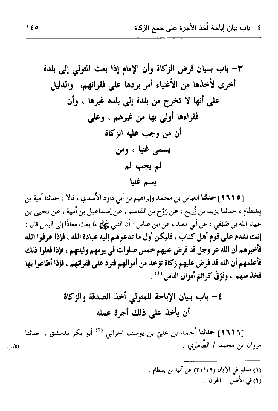 §بَابُ بَيَانِ فَرْضِ الزَّكَاةِ وَأَنَّ الْإِمَامَ إِذَا بَعَثَ الْمُتَوَلِّيَ إِلَى بَلْدَةٍ أُخْرَى لِأَخْذَهَا مِنَ الْأَغْنِيَاءِ أَمَرَ بَرَدِّهَا عَلَى فُقَرَائِهِمْ، وَالدَّلِيلِ عَلَى أَنَّهَا لَا تَخْرُجُ مِنْ بَلْدَةٍ إِلَى بَلْدَةٍ غَيْرِهَا، وَأَنَّ فُقَرَاءَهَا أَوْلَى بِهَا مِنْ غَيْرِهِمْ، وَعَلَى أَنَّ مَنْ وَجَبَ عَلَيْهِ الزَّكَاةُ يُسَمَّى غَنِيًّا، وَمَنْ لَمْ يَجِبْ لَمْ يُسَمَّ غَنِيًّا
