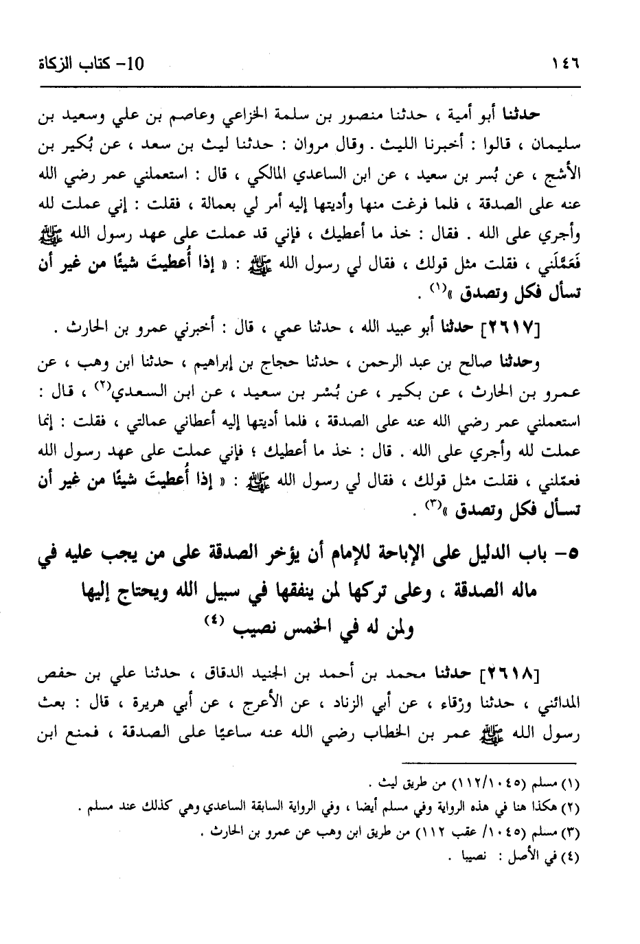 2617 - حَدَّثَنَا أَبُو عُبَيْدِ اللَّهِ، حَدَّثَنَا عَمِّي، قَالَ: أَخْبَرَنِي عَمْرُو بْنُ الْحَارِثِ، وَحَدَّثَنَا صَالِحُ بْنُ عَبْدِ الرَّحْمَنِ، حَدَّثَنَا حَجَّاجُ بْنُ إِبْرَاهِيمَ، حَدَّثَنَا ابْنُ وَهْبٍ، عَنْ عَمْرِو بْنِ الْحَارِثِ، عَنْ بُكَيْرٍ، عَنْ بُسْرِ بْنِ سَعِيدٍ، عَنِ ابْنِ السَّعْدِيِّ قَالَ: اسْتَعْمَلَنِي عُمَرُ رَضِيَ اللَّهُ عَنْهُ عَلَى الصَّدَقَةِ، فَلَمَّا أَدَّيْتُهَا إِلَيْهِ أَعْطَانِي عُمَالَتِي، فَقُلْتُ: إِنَّمَا عَمِلْتُ لِلَّهِ وَأَجْرِي عَلَى اللَّهِ، قَالَ: خُذْ مَا أُعْطِيكَ، فَإِنِّي عَمِلْتُ عَلَى عَهْدِ رَسُولِ اللَّهِ فَعَمَّلَنِي، فَقُلْتُ مِثْلَ قَوْلِكَ، فَقَالَ لِي رَسُولُ اللَّهِ صَلَّى اللهُ عَلَيْهِ وَسَلَّمَ: «§إِذَا أُعْطِيتَ شَيْئًا مِنْ غَيْرِ أَنْ تَسْأَلَ فَكُلْ وَتَصَدَّقْ»