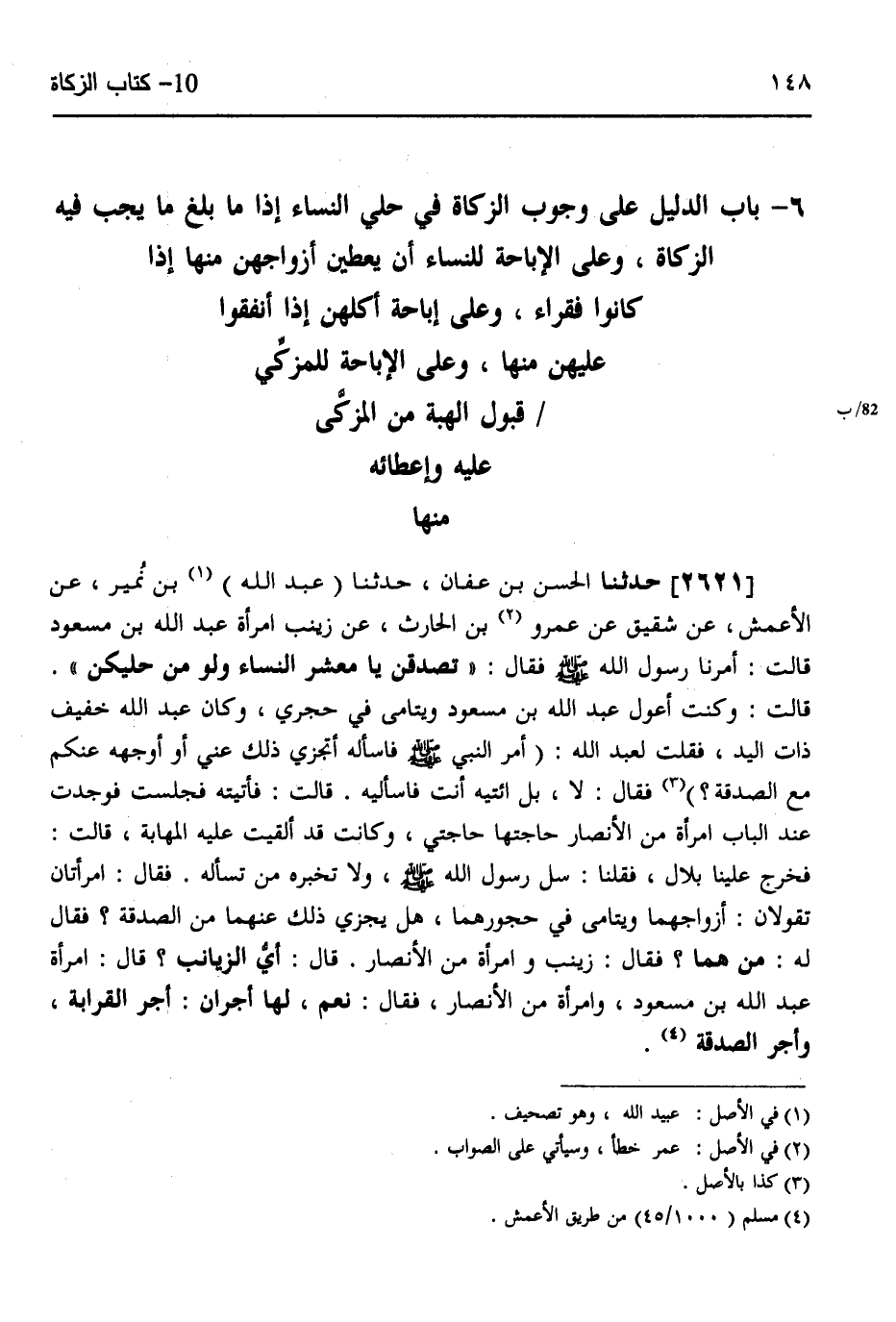 2621 - حَدَّثَنَا الْحَسَنُ بْنُ عَفَّانَ، حَدَّثَنَا عَبْدُ اللَّهِ بْنِ نُمَيْرٍ، عَنِ الْأَعْمَشِ، عَنْ شَقِيقٍ، عَنْ عَمْرِو بْنِ الْحَارِثِ،، عَنْ زَيْنَبَ امْرَأَةِ عَبْدِ اللَّهِ بْنِ مَسْعُودٍ قَالَتْ: أَمَرَنَا رَسُولُ اللَّهِ صَلَّى اللهُ عَلَيْهِ وَسَلَّمَ فَقَالَ: «§تَصَدَّقْنَ يَا مَعْشَرَ النِّسَاءِ، وَلَوْ مِنْ حَلْيِِكُنَّ» قَالَتْ: وَكُنْتُ أَعُولُ عَبْدَ اللَّهِ بْنَ مَسْعُودٍ وَيَتَامَى فِي حِجْرِي، وَكَانَ عَبْدُ اللَّهِ خَفِيفَ ذَاتِ الْيَدِ، فَقُلْتُ لِعَبْدِ اللَّهِ: أَمَرَ النَّبِيُّ صَلَّى اللهُ عَلَيْهِ وَسَلَّمَ فَاسْأَلْهُ أَتُجْزِي ذَلِكَ عَنِّي أَوْ أُوَجِّهُهُ عَنْكُمْ مَعَ الصَّدَقَةِ؟ فَقَالَ: لَا، بَلِ ائْتِيهِ أَنْتِ فَاسْأَلِيهِ، قَالَتْ: فَأَتَيْتُهُ فَجَلَسْتُ فَوَجَدْتُ عِنْدَ الْبَابِ امْرَأَةً مِنَ الْأَنْصَارِ حَاجَتُهَا حَاجَتِي، وَكَانَتْ قَدْ أُلْقِيَتْ عَلَيْهِ الْمَهَابَةُ، قَالَتْ: فَخَرَجَ عَلَيْنَا بِلَالٌ فَقُلْنَا: سَلْ رَسُولَ اللَّهِ صَلَّى اللهُ عَلَيْهِ وَسَلَّمَ وَلَا تُخْبِرْهُ مَنْ تَسْأَلُهُ، فَقَالَ: امْرَأَتَانِ تَقُولَانِ أَزْوَاجُهُمْا وَيَتَامَى فِي حُجُورِهِمَا، هَلْ يُجْزِي ذَلِكَ عَنْهُمْا مِنَ الصَّدَقَةِ؟ فَقَالَ لَهُ: «مَنْ هُمَا؟» فَقَالُ: زَيْنَبُ وَامْرَأَةٌ مِنَ الْأَنْصَارِ، قَالَ: «أَيُّ الزَّيَانِبِ؟» قَالَ: امْرَأَةُ عَبْدِ اللَّهِ بْنِ مَسْعُودٍ، وَامْرَأَةٌ مِنَ الْأَنْصَارِ، فَقَالَ: " نَعَمْ، لَهَا أَجْرَانِ: أَجْرُ الْقَرَابَةِ، وَأَجْرُ الصَّدَقَةِ "