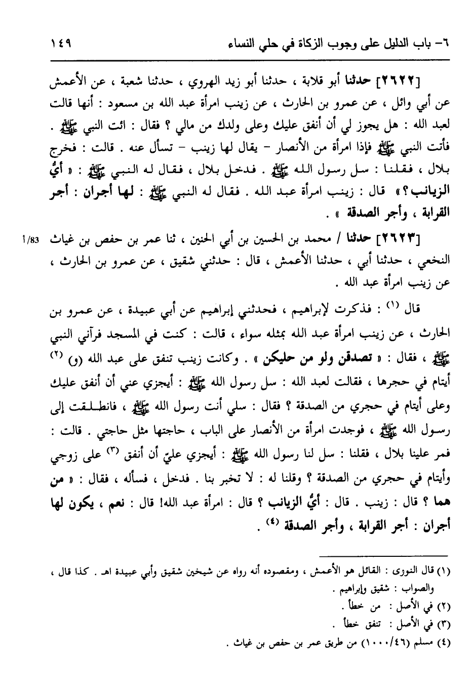 2623 - حَدَّثَنَا مُحَمَّدُ بْنُ الْحُسَيْنِ بْنِ أَبِي الْحُنَيْنِ، ثَنَا عُمَرُ بْنُ حَفْصِ بْنِ غِيَاثٍ النَّخَعِيُّ، حَدَّثَنَا أَبِي، حَدَّثَنَا الْأَعْمَشُ، قَالَ: حَدَّثَنِي شَقِيقٌ، عَنْ عَمْرِو بْنِ الْحَارِثِ، عَنْ زَيْنَبَ امْرَأَةِ عَبْدِ اللَّهِ، قَالَ: فَذَكَرْتُ لِإِبْرَاهِيمَ، فَحَدَّثَنِي: إِبْرَاهِيمُ، عَنْ أَبِي عُبَيْدَةَ، عَنِ عَمْرِو بْنِ الْحَارِثِ،، عَنْ زَيْنَبَ امْرَأَةِ عَبْدِ اللَّهِ، بِمِثْلِهِ سَوَاءٌ، قَالَتْ: كُنْتُ فِي الْمَسْجِدِ فَرَآنِي النَّبِيُّ صَلَّى اللهُ عَلَيْهِ وَسَلَّمَ فَقَالَ: «§تَصَدَّقْنَ وَلَوْ مِنْ حُلِيِّكُنَّ» وَكَانَتْ زَيْنَبُ تُنْفِقُ عَلَى عَبْدِ اللَّهِ وَأَيْتَامٍ فِي حِجْرِهَا، فَقَالَتْ لِعَبْدِ اللَّهِ: سَلْ رَسُولَ اللَّهِ صَلَّى اللهُ عَلَيْهِ وَسَلَّمَ أَيُجْزِي عَنِّي أَنْ أُنْفِقَ عَلَيْكَ وَعَلَى أَيْتَامٍ فِي حِجْرِي مِنَ الصَّدَقَةِ؟ فَقَالَ: سَلِي أَنْتِ رَسُولَ اللَّهِ صَلَّى اللهُ عَلَيْهِ وَسَلَّمَ، فَانْطَلَقْتُ إِلَى رَسُولِ اللَّهِ صَلَّى اللهُ عَلَيْهِ وَسَلَّمَ، فَوَجَدْتُ امْرَأَةً مِنَ الْأَنْصَارِ عَلَى الْبَابِ حَاجَتُهَا مِثْلُ حَاجَتِي، قَالَتْ: فَمَرَّ عَلَيْنَا بِلَالٌ فَقُلْنَا: سَلْ لَنَا رَسُولَ اللَّهِ صَلَّى اللهُ عَلَيْهِ وَسَلَّمَ: أَيُجْزِي عَلَيَّ أَنْ أُنْفِقَ عَلَى زَوْجِي وَأَيْتَامٍ فِي حِجْرِي مِنَ الصَّدَقَةِ؟ وَقُلْنَا لَهُ: لَا تُخْبِرْ بِنَا، فَدَخَلَ فَسَأَلَهُ فَقَالَ: «مَنْ هُمَا؟» قَالَ: زَيْنَبُ، قَالَ: «أَيُّ الزَّيَانِبِ؟» قَالَ: امْرَأَةُ عَبْدِ اللَّهِ، قَالَ: " نَعَمْ، يَكُونُ لَهَا أَجْرَانِ: أَجْرُ الْقَرَابَةِ، وَأَجْرُ الصَّدَقَةِ "