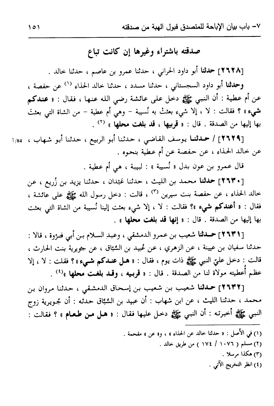 2630 - حَدَّثَنَا مُحَمَّدُ بْنُ اللَّيْثِ، حَدَّثَنَا عَبْدَانُ، حَدَّثَنَا يَزِيدُ بْنُ زُرَيْعٍ، عَنْ خَالِدٍ الْحَذَّاءِ،، عَنْ حَفْصَةَ بِنْتِ سِيرِينَ قَالَتْ: دَخَلَ رَسُولُ اللَّهِ صَلَّى اللهُ عَلَيْهِ وَسَلَّمَ عَلَى عَائِشَةَ فَقَالَ: «أَعِنْدَكُمْ شَيْءٌ؟» فَقَالَتْ: لَا، إِلَّا شَيْءٌ بَعَثَتْ إِلَيْنَا نُسَيْبَةُ مِنَ الشَّاةِ الَّتِي بَعَثْتَ بِهَا إِلَيْهَا مِنَ الصَّدَقَةِ، قَالَ: «إِنَّهَا §قَدْ بَلَغَتْ مَحِلَّهَا»