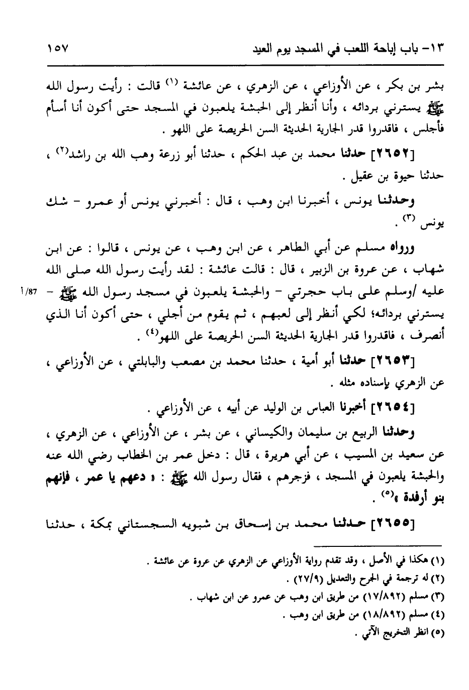 2652 - حَدَّثَنَا مُحَمَّدُ بْنُ عَبْدِ الْحَكَمِ، حَدَّثَنَا أَبُو زُرْعَةَ وَهْبُ اللَّهِ بْنُ رَاشِدٍ، حَدَّثَنَا حَيْوَةُ بْنُ عَقِيلٍ، وَحَدَّثَنَا يُونُسُ، أَخْبَرَنَا ابْنُ وَهْبٍ قَالَ: أَخْبَرَنِي يُونُسُ، أَوْ عَمْرٌو - شَكَّ يُونُسُ - وَرَوَاهُ مُسْلِمٌ، عَنْ أَبِي الطَّاهِرِ، عَنِ ابْنِ وَهْبٍ، عَنْ يُونُسَ قَالُوا: عَنِ ابْنِ شِهَابٍ، عَنْ عُرْوَةَ بْنِ الزُّبَيْرِ قَالَ: قَالَتْ عَائِشَةُ: «لَقَدْ §رَأَيْتُ رَسُولَ اللَّهِ صَلَّى اللهُ عَلَيْهِ وَسَلَّمَ عَلَى بَابِ حُجْرَتِي وَالْحَبَشَةُ يَلْعَبُونَ فِي مَسْجِدِ رَسُولِ اللَّهِ صَلَّى اللهُ عَلَيْهِ وَسَلَّمَ يَسْتُرُنِي بِرِدَائِهِ، لِكَيْ أَنْظُرَ إِلَى لَعِبِهِمْ، ثُمَّ يَقُومُ مِنْ أَجْلِي، حَتَّى أَكُونَ أَنَا الَّذِي أَنْصَرِفُ» فَاقْدُرُوا قَدْرَ الْجَارِيَةِ الْحَدِيثَةِ السِّنِّ الْحَرِيصَةِ عَلَى اللَّهْوِ،
