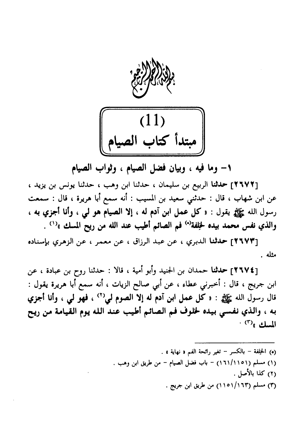 2672 - حَدَّثَنَا الرَّبِيعُ بْنُ سُلَيْمَانَ، حَدَّثَنَا ابْنُ وَهْبٍ، حَدَّثَنَا يُونُسُ بْنُ يَزِيدَ، عَنِ ابْنِ شِهَابٍ قَالَ: حَدَّثَنِي سَعِيدُ بْنُ الْمُسَيِّبِ أَنَّهُ، سَمِعَ أَبَا هُرَيْرَةَ قَالَ: سَمِعْتُ رَسُولَ اللَّهِ صَلَّى اللهُ عَلَيْهِ وَسَلَّمَ يَقُولُ: «§كُلُّ عَمِلِ ابْنِ آدَمَ لَهُ إِلَّا الصِّيَامُ هُوَ لِي، وَأَنَا أَجْزِي بِهِ، وَالَّذِي نَفْسُ مُحَمَّدٍ بِيَدِهِ لَخِلْفَةُ فَمِ الصَّائِمِ أَطْيَبُ عِنْدَ اللَّهِ مِنْ رِيحِ الْمِسْكِ»