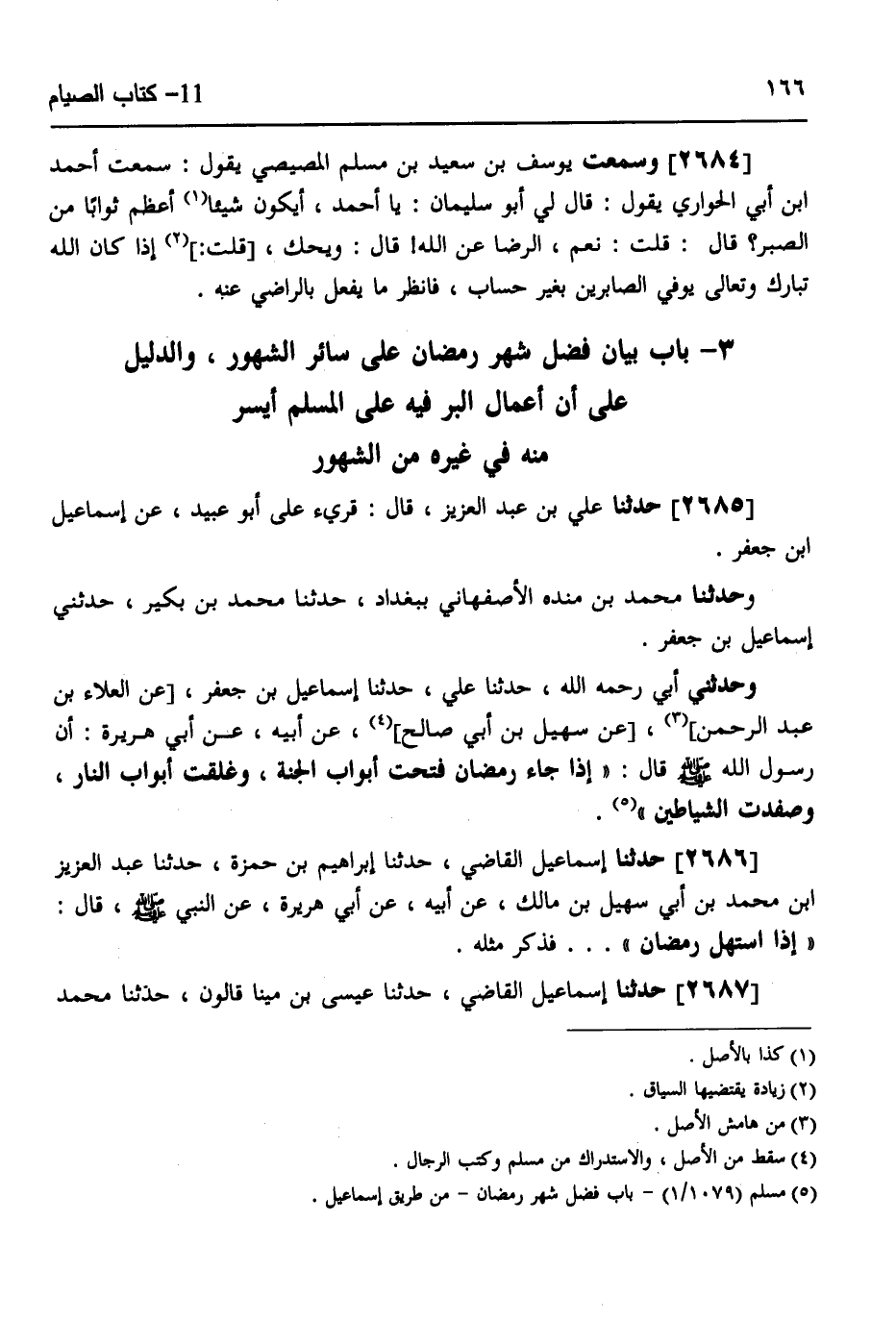 2686 - حَدَّثَنَا إِسْمَاعِيلُ الْقَاضِي، حَدَّثَنَا إِبْرَاهِيمُ بْنُ حَمْزَةَ، حَدَّثَنَا عَبْدُ الْعَزِيزِ بْنُ مُحَمَّدٍ عَنْ أَبِي سُهَيْلِ بْنِ مَالِكٍ، عَنْ أَبِيهِ، عَنْ أَبِي هُرَيْرَةَ، عَنِ النَّبِيِّ صَلَّى اللهُ عَلَيْهِ وَسَلَّمَ قَالَ: «إِذَا اسْتَهَلَّ رَمَضَانُ» . . . فَذَكَرَ مِثْلَهُ،