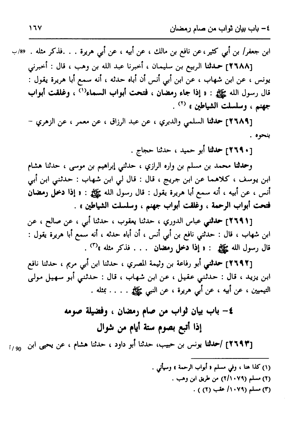 2690 - حَدَّثَنَا أَبُو حُمَيْدٍ، حَدَّثَنَا حَجَّاجٌ، وَحَدَّثَنَا مُحَمَّدُ بْنُ مُسْلِمِ بْنِ وَارَةَ الرَّازِيُّ، حَدَّثَنِي إِبْرَاهِيمُ بْنُ مُوسَى، حَدَّثَنَا هِشَامُ بْنُ يُوسُفَ كِلَاهُمْا، عَنِ ابْنِ جُرَيْجٍ قَالَ: قَالَ لِيَ ابْنُ شِهَابٍ: حَدَّثَنِي ابْنُ أَبِي أَنَسٍ، عَنْ أَبِيهِ، أَنَّهُ، سَمِعَ أَبَا هُرَيْرَةَ يَقُولُ: قَالَ رَسُولُ اللَّهِ صَلَّى اللهُ عَلَيْهِ وَسَلَّمَ: «§إِذَا دَخَلَ رَمَضَانُ فُتِّحَتْ أَبْوَابُ الرَّحْمَةِ، وَغُلِّقَتْ أَبْوَابُ جَهَنَّمَ، وَسُلْسِلَتِ الشَّيَاطِينُ»