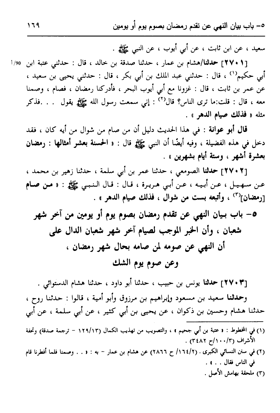 2703 - حَدَّثَنَا يُونُسُ بْنُ حَبِيبٍ، حَدَّثَنَا أَبُو دَاوُدَ، حَدَّثَنَا هِشَامٌ الدَّسْتُوَائِيُّ، وَحَدَّثَنا سَعِيدُ بْنُ مَسْعُودٍ، وَإِبْرَاهِيمُ بْنُ مَرْزُوقٍ، وَأَبُو أُمَيَّةَ، قَالُوا: حَدَّثَنَا رَوْحٌ، حَدَّثَنَا هِشَامٌ، وَحُسَيْنُ بْنُ ذَكْوَانَ، عَنْ يَحْيَى بْنِ أَبِي كَثِيرٍ، عَنْ أَبِي سَلَمَةَ،، عَنْ أَبِي -[170]- هُرَيْرَةَ أَنَّ النَّبِيَّ صَلَّى اللهُ عَلَيْهِ وَسَلَّمَ قَالَ: «§لَا تَقَدَّمُوا قَبْلَ رَمَضَانَ بِصَوْمِ يَوْمٍ وَلَا يَوْمَيْنِ، إِلَّا أَنْ يَكُونَ رَجُلٌ كَانَ يَصُومُ صَوْمًا فَلْيَصُمْهُ» وَقَالَ بَعْضُهُمْ: «يَصُومُ صِيَامًا فَلْيَصُمْهُ»