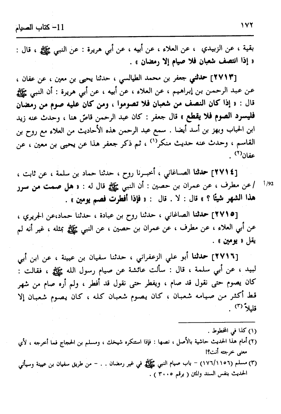 2713 - حَدَّثَنِي جَعْفَرُ بْنُ مُحَمَّدٍ الطَّيَالِسِيُّ، حَدَّثَنَا يَحْيَى بْنُ مَعِينٍ، عَنْ عَفَّانَ، عَنْ عَبْدِ الرَّحْمَنِ بْنِ إِبْرَاهِيمَ، عَنِ الْعَلَاءِ، عَنْ أَبِيهِ،، عَنْ أَبِي هُرَيْرَةَ أَنَّ النَّبِيَّ صَلَّى اللهُ عَلَيْهِ وَسَلَّمَ قَالَ: «§إِذَا كَانَ النِّصْفُ مِنْ شَعْبَانَ فَلَا تَصُومُوا، وَمَنْ كَانَ عَلَيْهِ صَوْمٌ مِنْ رَمَضَانَ فَلْيَسْرُدِ الصَّوْمَ فَلَا يَقْطَعْ» قَالَ جَعْفَرٌ: كَانَ عَبْدُ الرَّحْمَنِ قَاصًّا هُنَا، وَحَدَّثَ عَنْهُ زَيْدُ بْنُ الْحُبَابِ، وَبَهْزُ بْنُ أَسَدٍ أَيْضًا، سَمِعَ عَبْدُ الرَّحْمَنِ هَذِهِ الْأَحَادِيثَ مِنَ الْعَلَاءِ مَعَ رَوْحِ بْنِ الْقَاسِمِ وَحَدَّثَ عَنْهُ حَدِيثًا مُنْكَرًا، ثُمَّ ذَكَرَ جَعْفَرٌ هَذَا، عَنْ يَحْيَى بْنِ مَعِينٍ، عَنْ عَفَّانَ