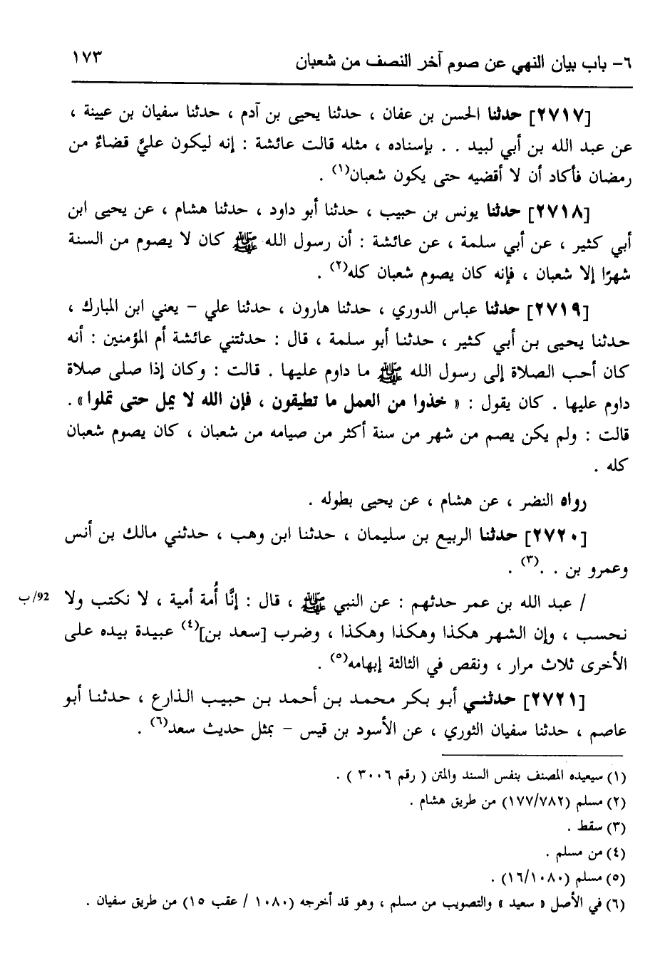 قَالَتْ: «§وَلَمْ يَكُنْ يَصُمْ مِنْ شَهْرٍ مِنْ سَنَةٍ أَكْثَرَ مِنْ صِيَامِهِ مِنْ شَعْبَانَ، كَانَ يَصُومُ شَعْبَانَ كُلَّهُ» رَوَاهُ النَّضْرُ، عَنْ هِشَامٍ، عَنْ يَحْيَى بِطُولِهِ