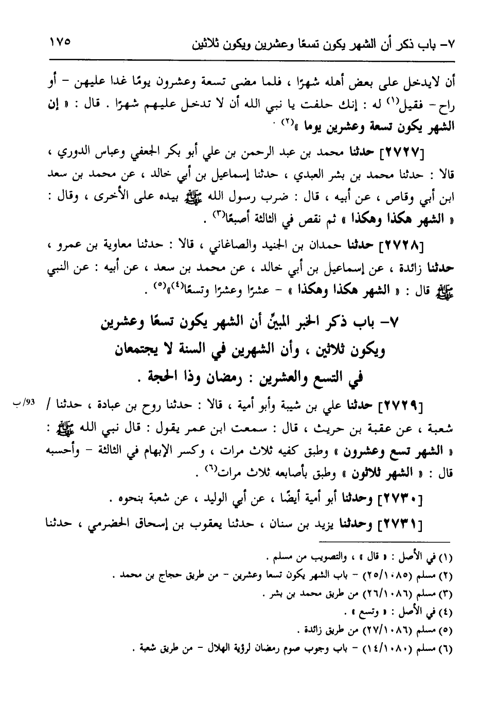 2731 - وَحَدَّثَنَا يَزِيدُ بْنُ سِنَانَ، حَدَّثَنَا يَعْقُوبُ بْنُ إِسْحَاقَ الْحَضْرَمِيُّ، حَدَّثَنَا -[176]- شُعْبَةُ، عَنْ عُقْبَةَ بْنِ حُرَيْثٍ،، عَنِ ابْنِ عُمَرَ، عَنِ النَّبِيِّ صَلَّى اللهُ عَلَيْهِ وَسَلَّمَ قَالَ: «§الشَّهْرُ تِسْعٌ وَعِشْرُونَ» قَالَ يَعْقُوبُ: وَأَحْسَبُهُ قَالَ أَيْضًا: «ثَلَاثُونَ»