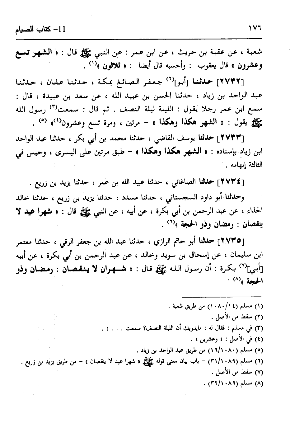 2732 - حَدَّثَنَا أَبُو جَعْفَرٍ الصَّائِغُ بِمَكَّةَ، حَدَّثَنَا عَفَّانُ، حَدَّثَنَا عَبْدُ الْوَاحِدِ بْنُ زِيَادٍ، حَدَّثَنَا الْحَسَنُ بْنُ عُبَيْدِ اللَّهِ، عَنْ سَعْدِ بْنِ عُبَيْدَةَ قَالَ: سَمِعَ ابْنَ عُمَرَ رَجُلًا يَقُولُ: اللَّيْلَةُ لَيْلَةُ النِّصْفِ، ثُمَّ قَالَ: سَمِعْتُ رَسُولَ اللَّهِ صَلَّى اللهُ عَلَيْهِ وَسَلَّمَ يَقُولُ: «§الشَّهْرُ هَكَذَا وَهَكَذَا» مَرَّتَيْنِ، وَمَرَّةً «تِسْعٌ وَعِشْرُونَ»