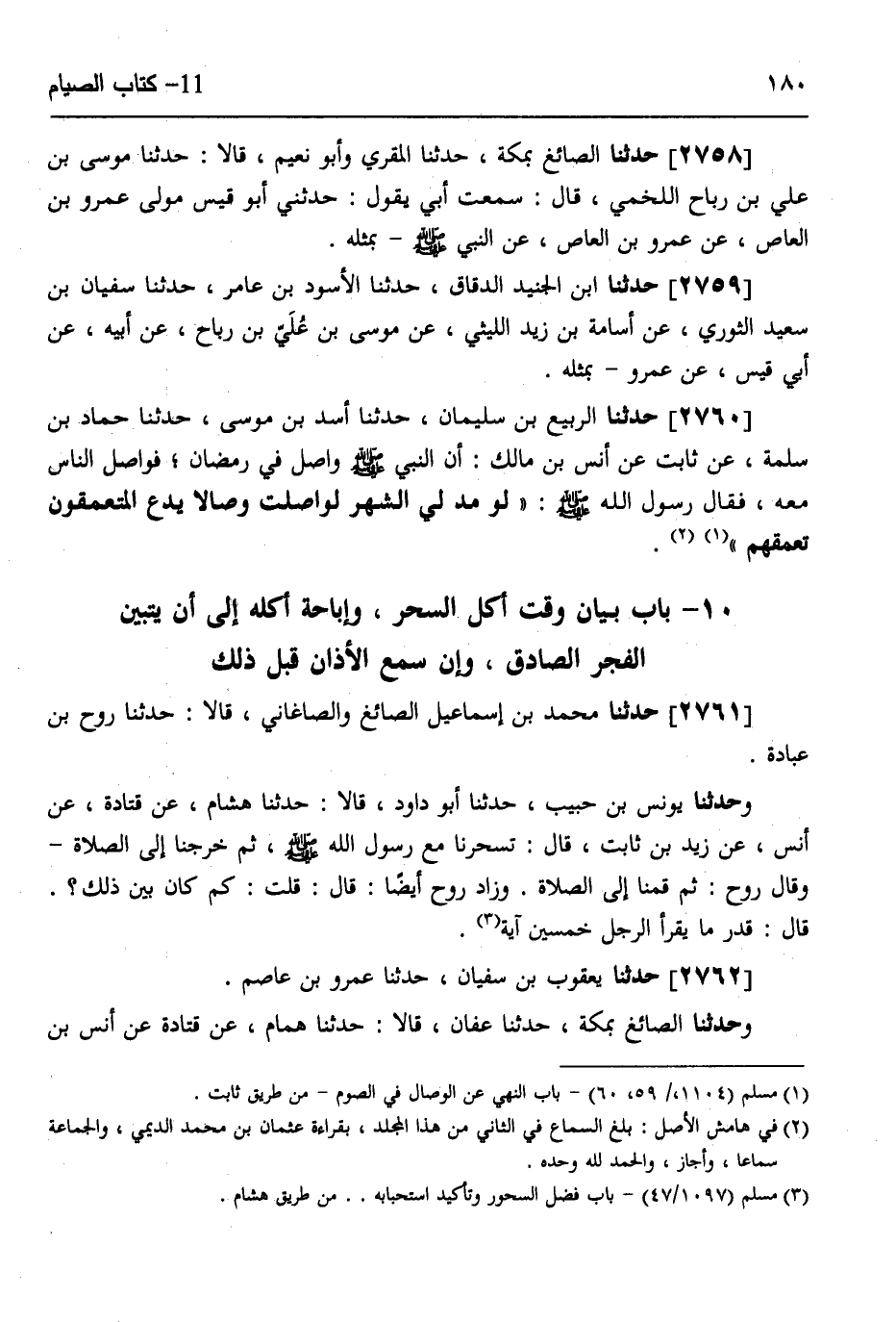 2761 - حَدَّثَنَا مُحَمَّدُ بْنُ إِسْمَاعِيلَ الصَّائِغُ، وَالصَّاغَانِيُّ، قَالَا: حَدَّثَنَا رَوْحُ بْنُ عُبَادَةَ، وَحَدَّثَنَا يُونُسُ بْنُ حَبِيبٍ، حَدَّثَنَا أَبُو دَاوُدَ، قَالَا: حَدَّثَنَا هِشَامٌ، عَنْ قَتَادَةَ، عَنْ أَنَسٍ،، عَنْ زَيْدِ بْنِ ثَابِتٍ قَالَ: «§تَسَحَّرْنَا مَعَ رَسُولِ اللَّهِ صَلَّى اللهُ عَلَيْهِ وَسَلَّمَ ثُمَّ خَرَجْنَا إِلَى الصَّلَاةِ» وَقَالَ رَوْحٌ: ثُمَّ قُمْنَا إِلَى الصَّلَاةِ، وَزَادَ رَوْحٌ أَيْضًا: قَالَ: قُلْتُ: كَمْ كَانَ بَيْنَ ذَلِكَ؟ قَالَ: قَدْرَ مَا يَقْرَأُ الرَّجُلُ خَمْسِينَ آيَةً