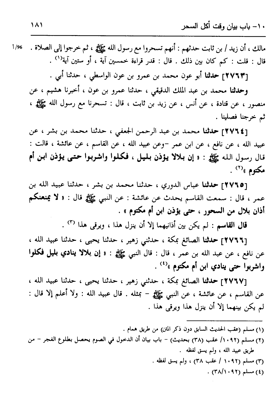 2766 - حَدَّثَنَا الصَّائِغُ بِمَكَّةَ، حَدَّثَنِي زُهَيْرٌ، حَدَّثَنَا يَحْيَى، حَدَّثَنَا عُبَيْدُ اللَّهِ، عَنْ نَافِعٍ،، عَنْ عَبْدِ اللَّهِ بْنِ عُمَرَ قَالَ: قَالَ النَّبِيُّ صَلَّى اللهُ عَلَيْهِ وَسَلَّمَ: «§إِنَّ بِلَالًا يُنَادِي بِلَيْلٍ، فَكُلُوا وَاشْرَبُوا حَتَّى يُنَادِيَ ابْنُ أُمِّ مَكْتُومٍ»