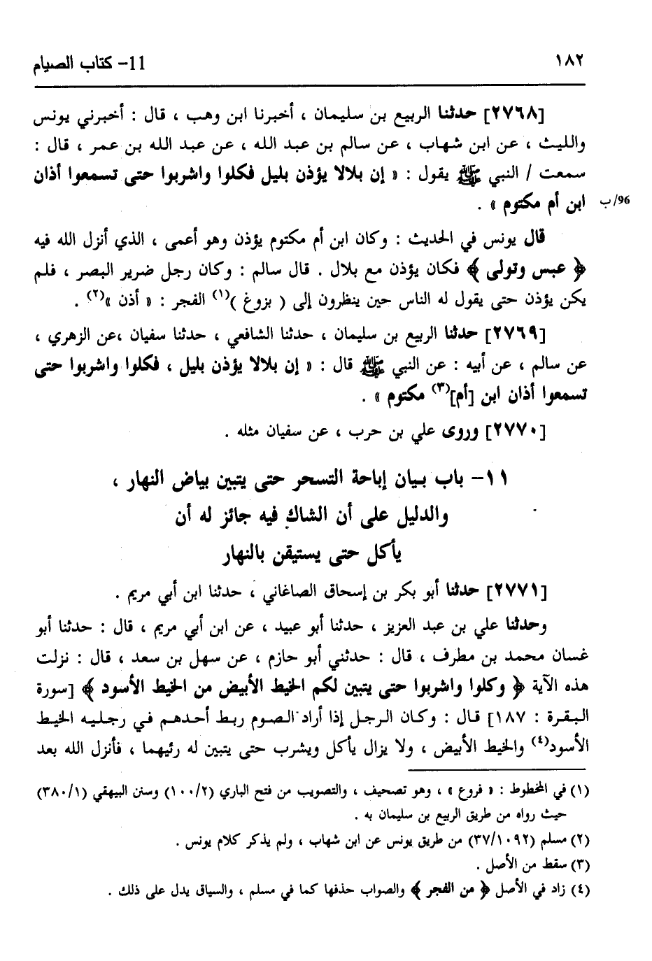 2769 - حَدَّثَنَا الرَّبِيعُ بْنُ سُلَيْمَانَ، حَدَّثَنَا الشَّافِعِيُّ، حَدَّثَنَا سُفْيَانُ، عَنِ الزُّهْرِيِّ، عَنْ سَالِمٍ، عَنْ أَبِيهِ، عَنِ النَّبِيِّ صَلَّى اللهُ عَلَيْهِ وَسَلَّمَ قَالَ: «§إِنَّ بِلَالًا يُؤَذِّنُ بِلَيْلٍ، فَكُلُوا وَاشْرَبُوا حَتَّى تَسْمَعُوا أَذَانَ ابْنِ أُمِّ مَكْتُومٍ»