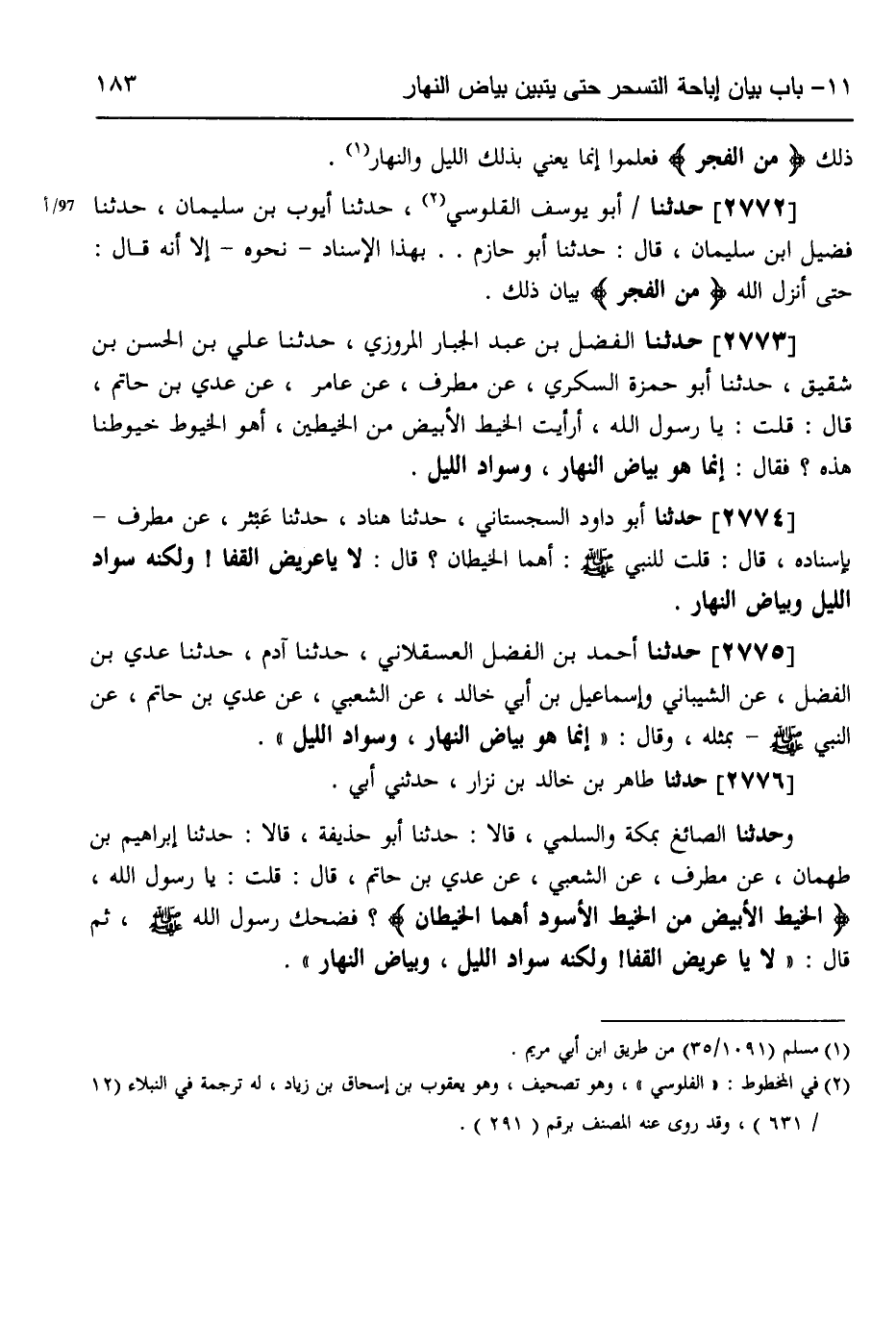 2776 - حَدَّثَنَا طَاهِرُ بْنُ خَالِدِ بْنِ نِزَارٍ، حَدَّثَنِي أَبِي، وَحَدَّثَنَا الصَّائِغُ بِمَكَّةَ، وَالسُّلَمِيُّ، قَالَا: حَدَّثَنَا أَبُو حُذَيْفَةَ، قَالَا: حَدَّثَنَا إِبْرَاهِيمُ بْنُ طَهْمَانَ، عَنْ مُطَرِّفٍ، عَنِ الشَّعْبِيِّ،، عَنْ عَدِيِّ بْنِ حَاتِمٍ قَالَ: قُلْتُ: يَا رَسُولَ اللَّهِ، الْخَيْطُ الْأَبْيَضُ مِنَ الْخَيْطِ الْأَسْوَدِ، أَهُمْا الْخَيْطَانِ؟ فَضَحِكَ رَسُولُ اللَّهِ صَلَّى اللهُ عَلَيْهِ وَسَلَّمَ، ثُمَّ قَالَ: «لَا يَا عَرِيضَ الْقَفَا، وَلَكِنَّهُ §سَوَادُ اللَّيْلِ، وَبَيَاضُ النَّهَارِ»