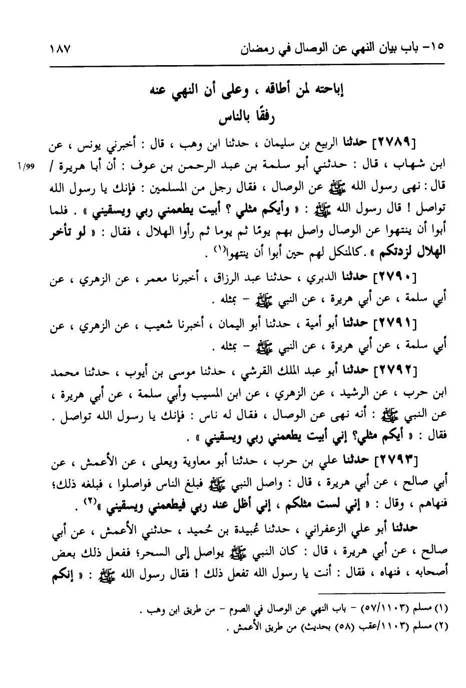 2793 - حَدَّثَنَا عَلِيُّ بْنُ حَرْبٍ، حَدَّثَنَا أَبُو مُعَاوِيَةَ، وَيَعْلَى، عَنِ الْأَعْمَشِ، عَنْ أَبِي صَالِحٍ،، عَنْ أَبِي هُرَيْرَةَ قَالَ: وَاصِلَ النَّبِيُّ صَلَّى اللهُ عَلَيْهِ وَسَلَّمَ فَبَلَغَ النَّاسَ فَوَاصَلُوا، فَبَلَغَهُ ذَلِكَ، فَنَهَاهُمْ وَقَالَ: «§إِنِّي لَسْتُ مِثْلَكُمْ، إِنِّي أَظَلُّ عِنْدَ رَبِّي فَيُطْعِمُنِي وَيَسْقِينِي»