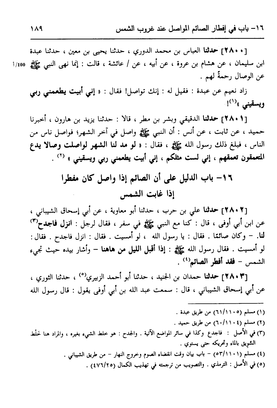 2802 - حَدَّثَنَا عَلِيُّ بْنُ حَرْبٍ، حَدَّثَنَا أَبُو مُعَاوِيَةَ، عَنْ أَبِي إِسْحَاقَ الشَّيْبَانِيِّ،، عَنِ ابْنِ أَبِي أَوْفَى قَالَ: كُنَّا مَعَ النَّبِيِّ صَلَّى اللهُ عَلَيْهِ وَسَلَّمَ فِي سَفَرٍ فَقَالَ لِرَجُلٍ: «انْزِلْ فَاجْدَحْ لَنَا» وَكَانَ صَائِمًا، فَقَالَ: يَا رَسُولَ اللَّهِ، لَوْ أَمْسَيْتَ، فَقَالَ: «انْزِلْ فَاجْدَحْ» فَقَالَ: لَوْ أَمْسَيْتَ، فَقَالَ رَسُولُ اللَّهِ صَلَّى اللهُ عَلَيْهِ وَسَلَّمَ: «§إِذَا أَقْبَلَ اللَّيْلُ مِنْ هَاهُنَا - وَأَشَارَ بِيَدِهِ حَيْثُ تَجِيءُ الشَّمْسُ - فَقَدْ أَفْطَرَ الصَّائِمُ»