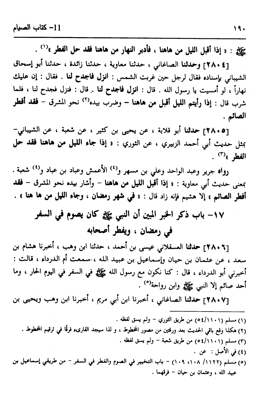 2805 - حَدَّثَنَا أَبُو قِلَابَةَ، عَنْ يَحْيَى بْنِ كَثِيرٍ، عَنْ شُعْبَةَ، عَنِ الشَّيْبَانِيِّ، بِمِثْلِ حَدِيثِ أَبِي أَحْمَدَ الزُّبَيْرِيِّ عَنِ الثَّوْرِيِّ: «§إِذَا جَاءَ اللَّيْلُ مِنْ هَاهُنَا فَقَدْ حَلَّ الْفِطْرُ» رَوَاهُ جَرِيرٌ، وَعَبْدُ الْوَاحِدِ، وَعَلِيُّ بْنُ مُسْهِرٍ، وَالْأَعْمَشُ، وَعَبَّادُ بْنُ عَبَّادٍ، وَشُعْبَةُ، بِمَعْنَى حَدِيثِ أَبِي مُعَاوِيَةَ: «إِذَا أَقْبَلَ اللَّيْلُ مِنْ هَاهُنَا - وَأَشَارَ بِيَدِهِ نَحْوَ الْمَشْرِقِ - فَقَدْ أَفْطَرَ الصَّائِمُ» إِلَّا هُشَيْمٌ فَإِنَّهُ زَادَ قَالَ: «فِي شَهْرِ رَمَضَانَ وَجَاءَ اللَّيْلُ مِنْ هَاهُنَا»