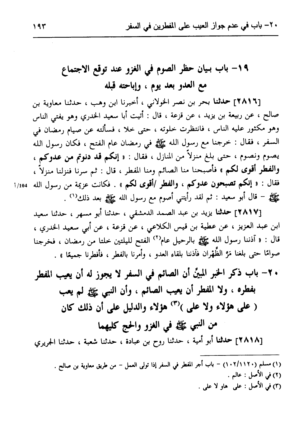 2818 - حَدَّثَنَا أَبُو أُمَيَّةَ، حَدَّثَنَا رَوْحُ بْنُ عُبَادَةَ، حَدَّثَنَا شُعْبَةُ، حَدَّثَنَا الْجُرَيْرِيُّ -[194]-، وَأَبُو مَسْلَمَةَ، عَنْ أَبِي نَضْرَةَ،، عَنْ أَبِي سَعِيدٍ قَالَ: «§كُنَّا مَعَ رَسُولِ اللَّهِ صَلَّى اللهُ عَلَيْهِ وَسَلَّمَ فِي رَمَضَانَ فَصَامَ صَائِمُونَ وَأَفْطِرْ مُفْطِرُونَ فَلَمْ يَعِبْ هَؤُلَاءِ عَلَى هَؤُلَاءِ وَلَا هَؤُلَاءِ عَلَى هَؤُلَاءِ»