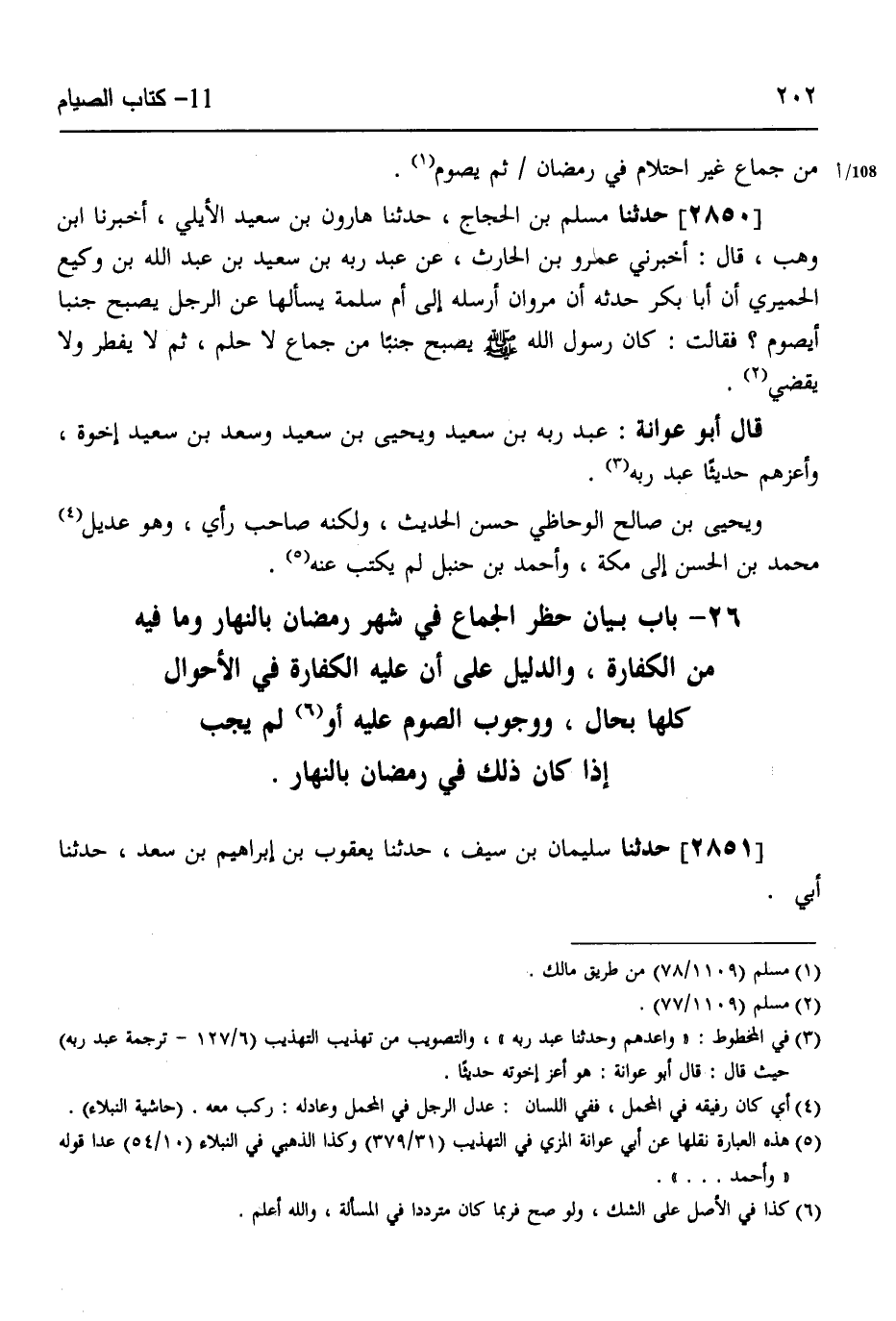 2850 - حَدَّثَنَا مُسْلِمُ بْنُ الْحَجَّاجِ، حَدَّثَنَا هَارُونُ بْنُ سَعِيدٍ الْأَيْلِيُّ، أَخْبَرَنَا ابْنُ وَهْبٍ قَالَ: أَخْبَرَنِي عَمْرُو بْنُ الْحَارِثِ، عَنْ عَبْدِ رَبِّهِ بْنِ سَعِيدِ بْنِ عَبْدِ اللَّهِ بْنِ وَكِيعٍ الْحِمْيَرِيِّ، أَنَّ أَبَا بَكْرٍ حَدَّثَهُ أَنَّ مَرْوَانَ أَرْسَلَهُ إِلَى أُمِّ سَلَمَةَ يَسْأَلُهَا عَنِ الرَّجُلِ يُصْبِحُ جُنُبًا أَيَصُومُ؟ فَقَالَتْ: «كَانَ رَسُولُ اللَّهِ صَلَّى اللهُ عَلَيْهِ وَسَلَّمَ §يُصْبِحُ جُنُبًا مِنْ جِمَاعٍ لَا حُلُمٍ ثُمَّ لَا يُفْطِرُ وَلَا يَقْضِي» قَالَ أَبُو عَوَانَةَ: عَبْدُ رَبِّهِ بْنُ سَعِيدٍ، وَيَحْيَى بْنُ سَعِيدٍ، وَسَعْدُ بْنُ سَعِيدٍ إِخْوَةٌ، وَأَعَزُّهُمْ حَدِيثًا عَبْدُ رَبِّهِ، وَيَحْيَى بْنُ صَالِحٍ الْوُحَاظِيُّ حَسَنُ الْحَدِيثِ، وَلَكِنَّهُ صَاحِبُ رَأْيٍ، وَهُوَ عَدِيلُ مُحَمَّدِ بْنِ الْحَسَنِ إِلَى مَكَّةَ، وَأَحْمَدُ بْنُ حَنْبَلٍ لَمْ يَكْتُبْ عَنْهُ