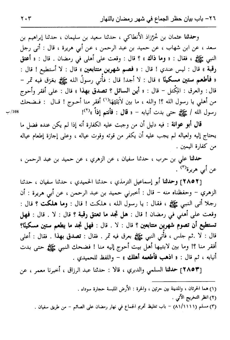 2853 - حَدَّثَنَا السُّلَمِيُّ، وَالدَّبَرِيُّ، قَالَا: حَدَّثَنَا عَبْدُ الرَّزَّاقِ، أَخْبَرَنَا مَعْمَرٌ، عَنِ -[204]- الزُّهْرِيِّ، عَنْ حُمَيْدِ بْنِ عَبْدِ الرَّحْمَنِ،، عَنْ أَبِي هُرَيْرَةَ أَنَّ رَجُلًا جَاءَ إِلَى النَّبِيِّ صَلَّى اللهُ عَلَيْهِ وَسَلَّمَ فَقَالَ: يَا رَسُولَ اللَّهِ، هَلَكْتُ، قَالَ: «وَمَا ذَاكَ؟» قَالَ: وَاقَعْتُ أَهْلِي فِي رَمَضَانَ، قَالَ: «§أَتَجِدُ رَقَبَةً؟» قَالَ: لَا، قَالَ: «أَتَسْتَطِيعُ أَنْ تَصُومَ شَهْرَيْنِ مُتَتَابِعَيْنِ؟» قَالَ: لَا، قَالَ: «فَأَطْعِمْ سِتِّينَ مِسْكِينًا» قَالَ: لَا أَجِدُ يَا رَسُولَ اللَّهِ، قَالَ: فَأُتِيَ النَّبِيُّ صَلَّى اللهُ عَلَيْهِ وَسَلَّمَ بِعَرَقٍ - وَالْعَرَقُ الْمِكْتَلُ - فِيهِ تَمْرٌ، فَقَالَ: «اذْهَبْ فَتَصَدَّقْ بِهَذَا» فَقَالَ: أَعَلَى أَفْقَرَ مِنِّي، فَوَالَّذِي بَعَثَكَ بِالْحَقِّ مَا بَيْنَ لَابَتَيْهَا أَهْلُ بَيْتٍ أَحْوَجُ إِلَيْهِ مِنَّا، فَضَحِكَ رَسُولُ اللَّهِ صَلَّى اللهُ عَلَيْهِ وَسَلَّمَ ثُمَّ قَالَ: «اذْهَبْ بِهِ إِلَى أَهْلِكَ» قَالَ الزُّهْرِيُّ: وَإِنَّمَا كَانَ هَذَا رُخْصَةٌ لِرَجُلٍ وَاحِدٍ وَلَوْ أَنَّ رَجُلًا فَعَلَ ذَلِكَ الْيَوْمَ لَمْ يَكُنْ بُدٌّ لَهُ مِنَ التَّكْفِيرِ