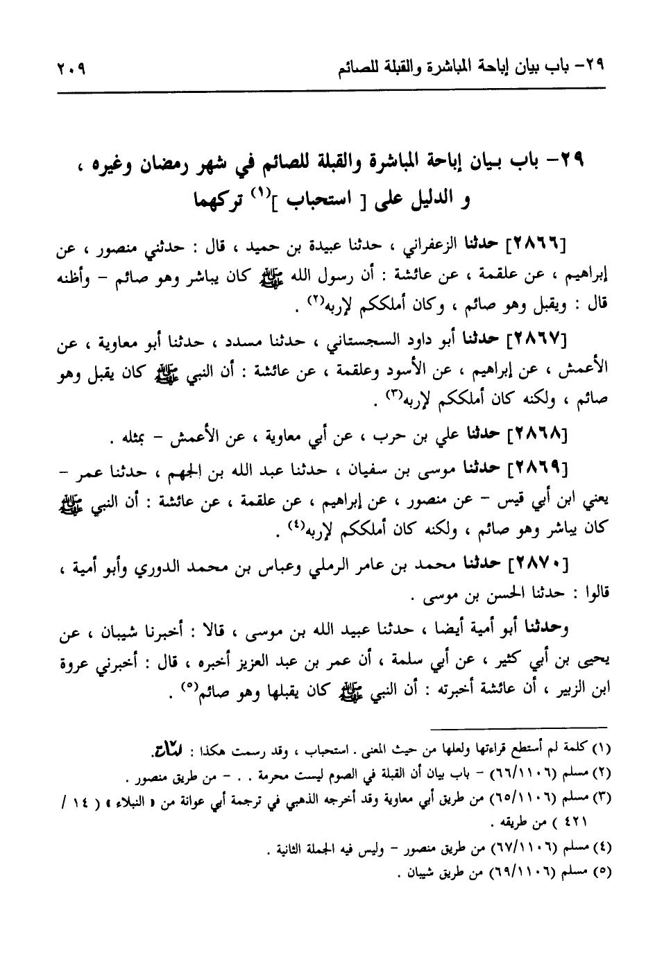 2866 - حَدَّثَنَا الزَّعْفَرَانِيُّ، حَدَّثَنَا عَبِيدَةُ بْنُ حُمَيْدٍ، قَالَ: حَدَّثَنِي مَنْصُورٌ، عَنْ إِبْرَاهِيمَ، عَنْ عَلْقَمَةَ،، عَنْ عَائِشَةَ: «أَنَّ رَسُولَ اللَّهِ صَلَّى اللهُ عَلَيْهِ وَسَلَّمَ كَانَ §يُبَاشِرُ وَهُوَ صَائِمٌ - وَأَظُنُّهُ قَالَ - وَيُقَبِّلُ وَهُوَ صَائِمٌ، وَكَانَ أَمْلَكَكُمْ لِإِرْبِهِ»