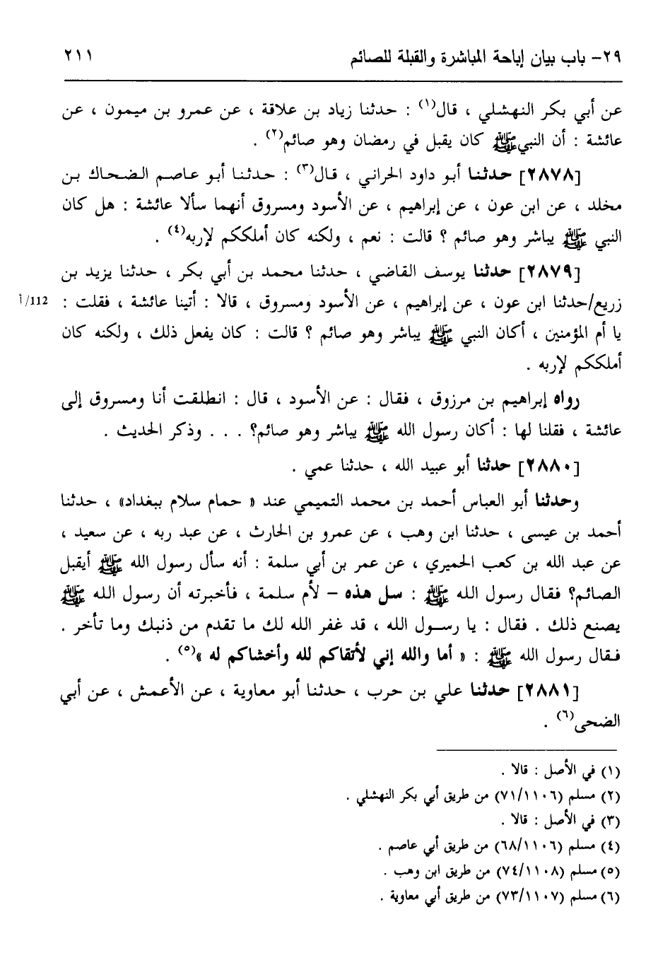 2879 - حَدَّثَنَا يُوسُفُ الْقَاضِي، حَدَّثَنَا مُحَمَّدُ بْنُ أَبِي بَكْرٍ، حَدَّثَنَا يَزِيدُ بْنُ زُرَيْعٍ، حَدَّثَنَا ابْنُ عَوْنٍ، عَنْ إِبْرَاهِيمَ، عَنِ الْأَسْوَدِ، وَمَسْرُوقٍ، قَالَا: أَتَيْنَا عَائِشَةَ فَقُلْتُ: يَا أُمَّ الْمُؤْمِنِينَ، أَكَانَ النَّبِيُّ صَلَّى اللهُ عَلَيْهِ وَسَلَّمَ §يُبَاشِرُ وَهُوَ صَائِمٌ؟ قَالَتْ: «كَانَ يَفْعَلُ ذَلِكَ، وَلَكِنَّهُ كَانَ أَمْلَكَكُمْ لِإِرْبِهِ» رَوَاهُ إِبْرَاهِيمُ بْنُ مَرْزُوقٍ فَقَالَ: عَنِ الْأَسْوَدِ قَالَ: انْطَلَقْتُ أَنَا وَمَسْرُوقٌ إِلَى عَائِشَةَ فَقُلْنَا لَهَا: أَكَانَ رَسُولُ اللَّهِ صَلَّى اللهُ عَلَيْهِ وَسَلَّمَ يُبَاشِرُ وَهُوَ صَائِمٌ، وَذَكَرَ الْحَدِيثَ