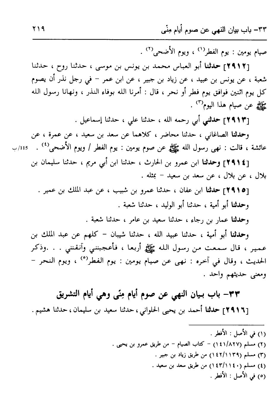 2915 - حَدَّثَنَا ابْنُ عَفَّانَ، حَدَّثَنَا عَمْرُو بْنُ شَبِيبٍ، عَنْ عَبْدِ الْمَلِكِ بْنِ عُمَيْرٍ، وَحَدَّثَنَا أَبُو أُمَيَّةَ، حَدَّثَنَا أَبُو الْوَلِيدِ، حَدَّثَنَا شُعْبَةُ، وَحَدَّثَنَا عَمَّارُ بْنُ رَجَاءٍ، حَدَّثَنَا سَعِيدُ بْنُ عَامِرٍ، حَدَّثَنَا شُعْبَةُ، وَحَدَّثَنَا أَبُو أُمَيَّةَ، حَدَّثَنَا عُبَيْدُ اللَّهِ، حَدَّثَنَا شَيْبَانُ كُلُّهُمْ،، عَنْ عَبْدِ الْمَلِكِ بْنِ عُمَيْرٍ، قَالَ: سَمِعْتُ مِنْ رَسُولِ اللَّهِ صَلَّى اللهُ عَلَيْهِ وَسَلَّمَ أَرْبَعًا فَأَعْجَبْنَنِي وَآنَقْنَنِي، وَذَكَرَ الْحَدِيثَ، وَقَالَ فِي آخِرِهِ: " §نَهَى عَنِ صِيَامِ يَوْمَيْنِ: يَوْمُ الْفِطْرِ، وَيَوْمُ النَّحْرِ " وَمَعْنَى حَدِيثِهِمْ وَاحِدٌ