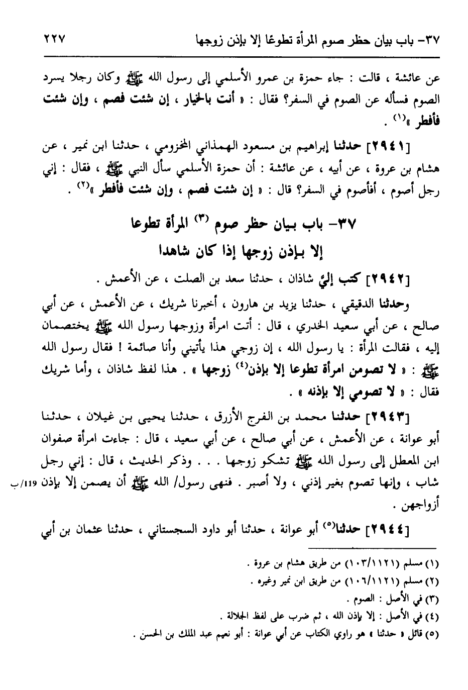 2944 - حَدَّثَنَا أَبُو عَوَانَةَ، حَدَّثَنَا أَبُو دَاوُدَ السِّجِسْتَانِيُّ، حَدَّثَنَا عُثْمَانُ بْنُ أَبِي -[228]- شَيْبَةَ، حَدَّثَنَا جَرِيرٌ، عَنِ الْأَعْمَشِ، عَنْ أَبِي صَالِحٍ،، عَنْ أَبِي سَعِيدٍ الْخُدْرِيِّ قَالَ: جَاءَتِ امْرَأَةٌ إِلَى النَّبِيِّ صَلَّى اللهُ عَلَيْهِ وَسَلَّمَ وَزَوْجُهَا يَخْتَصِمَانِ إِلَيْهِ، فَقَالَ النَّبِيُّ صَلَّى اللهُ عَلَيْهِ وَسَلَّمَ: «§لَا تَصُومَنَّ إِحْدَاكُنَّ إِلَّا بِإِذْنِ زَوْجِهَا» وَذَكَرَ الْحَدِيثَ