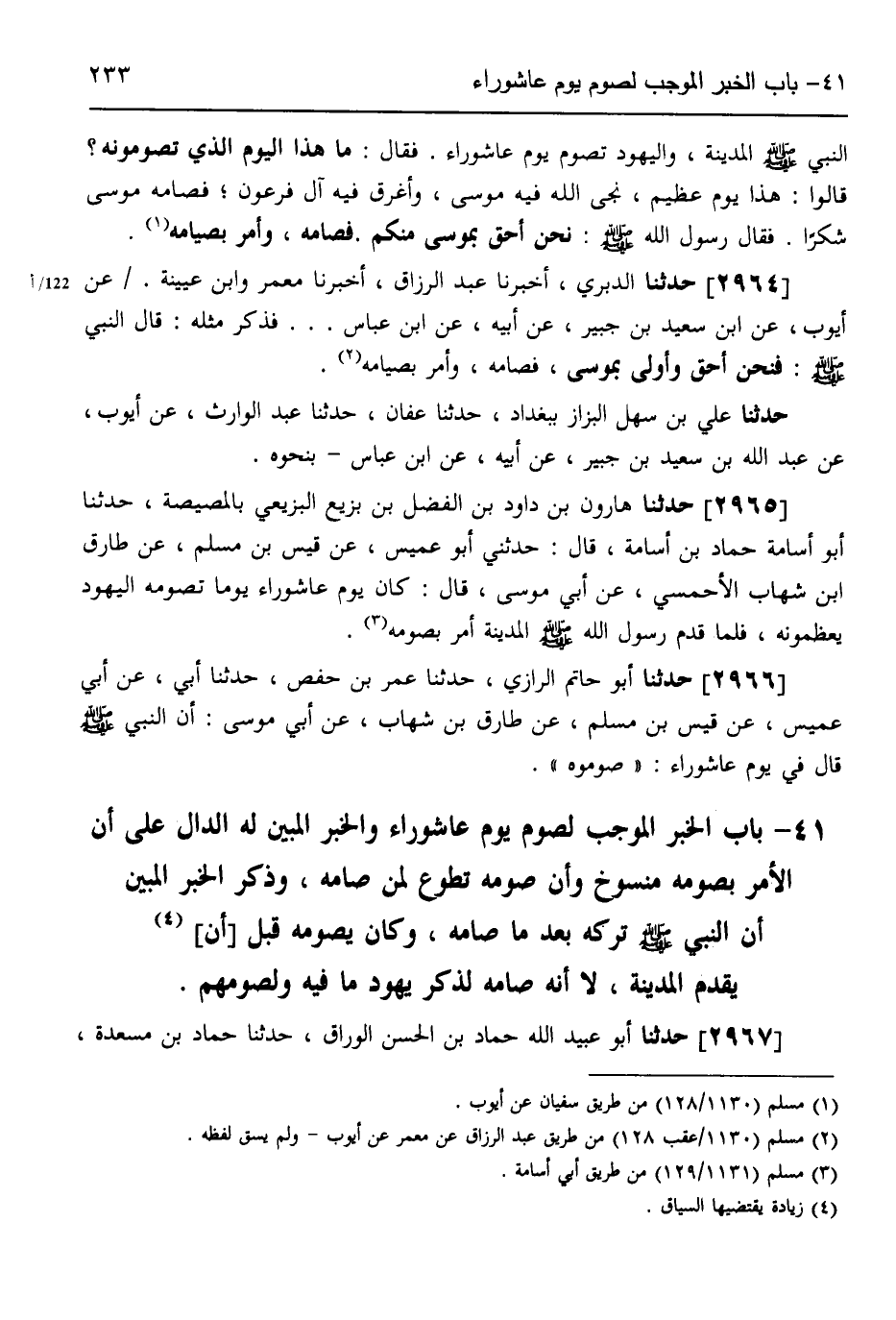 2965 - حَدَّثَنَا هَارُونُ بْنُ دَاوُدَ بْنِ الْفَضْلِ بْنِ بَزِيعٍ الْبَزِيعِيُّ بِالْمِصِّيصَةِ، حَدَّثَنَا أَبُو أُسَامَةَ حَمَّادُ بْنُ أُسَامَةَ قَالَ: حَدَّثَنِي أَبُو عُمَيْسٍ، عَنْ قَيْسِ بْنِ مُسْلِمٍ، عَنْ طَارِقِ بْنِ شِهَابٍ الْأَحْمَسِيِّ،، عَنْ أَبِي مُوسَى، قَالَ: §كَانَ يَوْمُ عَاشُورَاءَ يَوْمًا تَصُومُهُ الْيَهُودُ يُعَظِّمُونَهُ «فَلَمَّا قَدِمَ رَسُولُ اللَّهِ صَلَّى اللهُ عَلَيْهِ وَسَلَّمَ الْمَدِينَةَ أَمَرَ بِصَوْمِهِ»