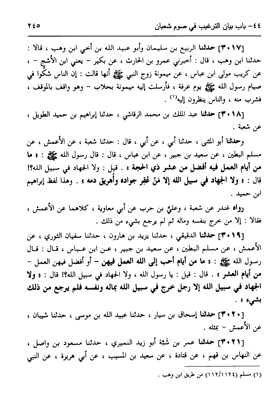 3019 - حَدَّثَنَا الدَّقِيقِيُّ، حَدَّثَنَا يَزِيدُ بْنُ هَارُونَ، حَدَّثَنَا سُفْيَانُ الثَّوْرِيُّ، عَنِ الْأَعْمَشِ، عَنْ مُسْلِمٍ الْبَطِينِ، عَنْ سَعِيدِ بْنِ جُبَيْرٍ،، عَنِ ابْنِ عَبَّاسٍ، قَالَ: قَالَ رَسُولُ اللَّهِ صَلَّى اللهُ عَلَيْهِ وَسَلَّمَ: «§مَا مِنْ أَيَّامٍ أَحَبُّ إِلَى اللَّهِ الْعَمَلُ فِيهِنَّ - أَوْ أَفْضَلُ فِيهِنَّ الْعَمَلُ - مِنْ أَيَّامِ الْعَشْرِ» قَالَ: قِيلَ: يَا رَسُولَ اللَّهِ، وَلَا الْجِهَادُ فِي سَبِيلِ اللَّهِ؟ قَالَ: «وَلَا الْجِهَادُ فِي سَبِيلِ اللَّهِ، إِلَّا رَجُلٌ خَرَجَ فِي سَبِيلِ اللَّهِ بِمَالِهِ وَنَفْسِهِ فَلَمْ يَرْجِعْ مِنْ ذَلِكَ بِشَيْءٍ»