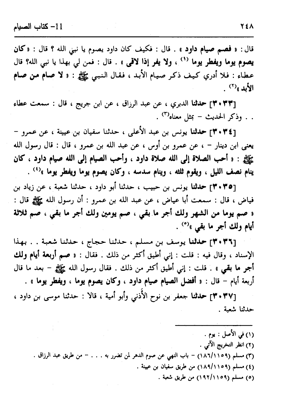 3036 - حَدَّثَنَا يُوسُفُ بْنُ مُسْلِمٍ، حَدَّثَنَا حَجَّاجٌ، حَدَّثَنَا شُعْبَةُ، بِهَذَا الْإِسْنَادِ، وَقَالَ فِيهِ: قُلْتُ: إِنِّي أُطِيقُ أَكْثَرَ مِنْ ذَلِكَ فَقَالَ: «صُمْ أَرْبَعَةَ أَيَّامٍ وَلَكَ أَجْرُ مَا بَقِيَ» قُلْتُ: إِنِّي أُطِيقُ أَكْثَرَ مِنْ ذَلِكَ، فَقَالَ رَسُولُ اللَّهِ صَلَّى اللهُ عَلَيْهِ وَسَلَّمَ بَعْدَ مَا قَالَ أَرْبَعَةَ أَيَّامٍ، قَالَ: «§أَفْضَلُ الصِّيَامِ صِيَامُ دَاوُدَ، وَكَانَ يَصُومُ يَوْمًا وَيُفْطِرُ يَوْمًا»