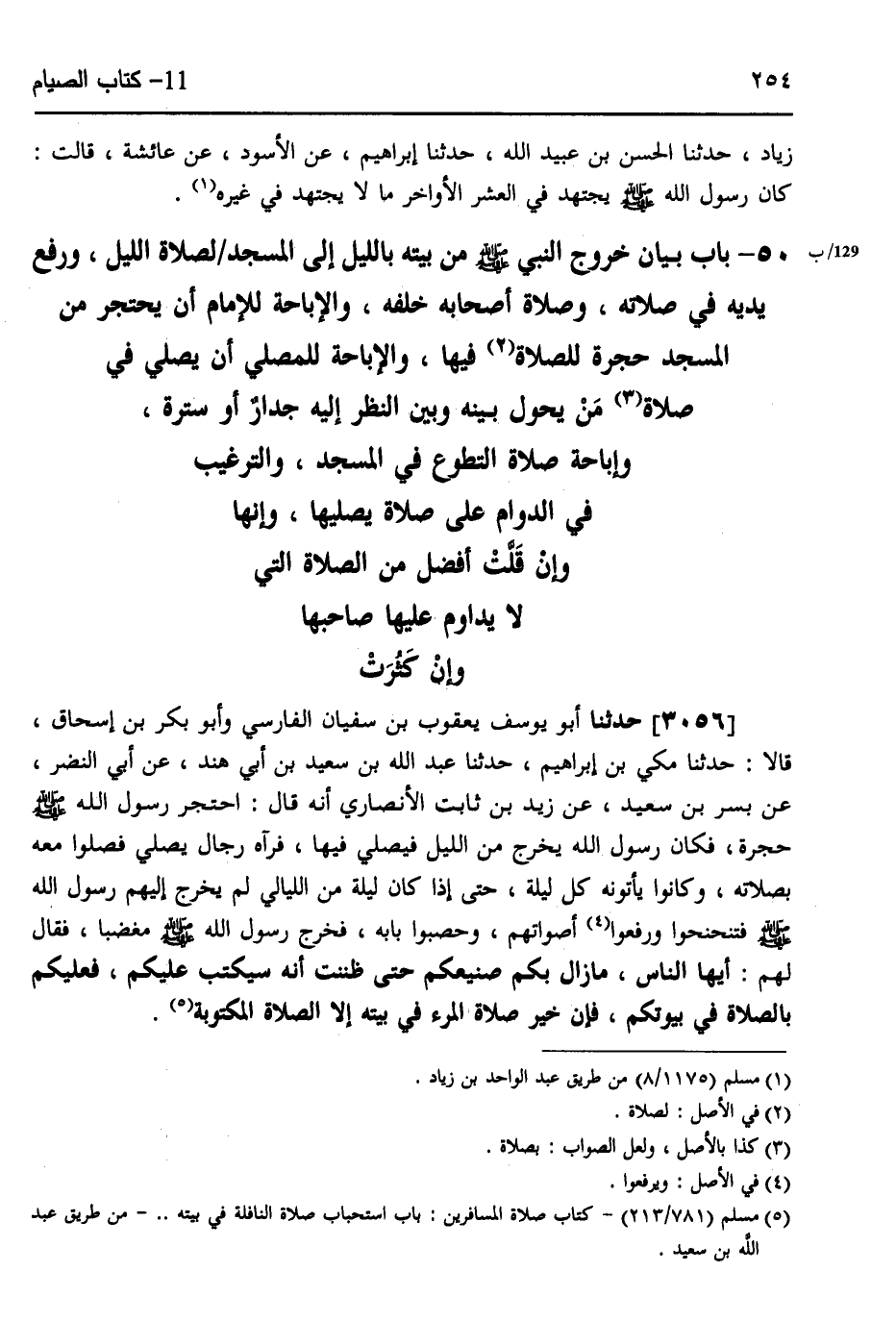 3056 - حَدَّثَنَا أَبُو يُوسُفَ يَعْقُوبُ بْنُ سُفْيَانَ الْفَارِسِيُّ، وَأَبُو بَكْرِ بْنُ إِسْحَاقَ قَالَا: حَدَّثَنَا مَكِّيُّ بْنُ إِبْرَاهِيمَ، حَدَّثَنَا عَبْدُ اللَّهِ بْنُ سَعِيدِ بْنِ أَبِي هِنْدٍ، عَنْ أَبِي النَّضْرِ، عَنْ بُسْرِ بْنِ سَعِيدٍ، عَنْ زَيْدِ بْنِ ثَابِتٍ الْأَنْصَارِيِّ، أَنَّهُ قَالَ: احْتَجَرَ رَسُولُ اللَّهِ صَلَّى اللهُ عَلَيْهِ وَسَلَّمَ حُجْرَةً، فَكَانَ رَسُولُ اللَّهِ يَخْرُجُ مِنَ اللَّيْلِ فَيُصَلِّي فِيهَا، فَرَآهُ رِجَالٌ يُصَلِّي، فَصَلَّوْا مَعَهُ بِصَلَاتِهِ، وَكَانُوا يَأْتُونَهُ كُلَّ لَيْلَةٍ، حَتَّى إِذَا كَانَ لَيْلَةٌ مِنَ اللَّيَالِي، لَمْ يَخْرُجْ إِلَيْهِمْ رَسُولُ اللَّهِ صَلَّى اللهُ عَلَيْهِ وَسَلَّمَ، فَتَنَحْنَحُوا وَرَفَعُوا أَصْوَاتَهُمْ وَحَصَبُوا بَابَهُ، فَخَرَجَ رَسُولُ اللَّهِ صَلَّى اللهُ عَلَيْهِ وَسَلَّمَ مُغْضَبًا فَقَالَ لَهُمْ: «أَيُّهَا النَّاسُ مَا زَالَ بِكُمْ صَنِيعُكُمْ حَتَّى ظَنَنْتُ أَنَّهُ سَيُكْتَبُ عَلَيْكُمْ، فَعَلَيْكُمْ بِالصَّلَاةِ فِي بُيُوتِكُمْ فَإِنَّ §خَيْرَ صَلَاةِ الْمَرْءِ فِي بَيْتِهِ إِلَّا الصَّلَاةَ الْمَكْتُوبَةَ»