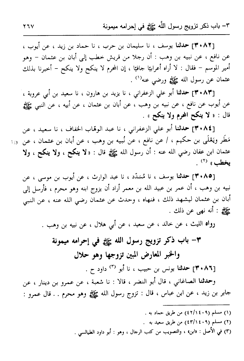 3086 - حَدَّثَنَا يُونُسُ بْنُ حَبِيبٍ، نَا أَبُو دَاوُدَ، ح وَحَدَّثَنَا الصَّاغَانِيُّ، قَالَ أَبُو النَّضْرِ قَالَا: نَا شُعْبَةُ، عَنْ عَمْرِو بْنِ دِينَارٍ، عَنْ جَابِرِ بْنِ زَيْدٍ،، عَنِ ابْنِ عَبَّاسٍ، قَالَ: «§تَزَوَّجَ رَسُولُ اللَّهِ صَلَّى اللهُ عَلَيْهِ وَسَلَّمَ وَهُوَ مُحْرِمٌ» قَالَ عَمْرٌو -[268]-: قَالَ لِي جَابِرٌ: أَرَاهَا مَيْمُونَةَ، هَذَا فِي حَدِيثِ أَبِي دَاوُدَ