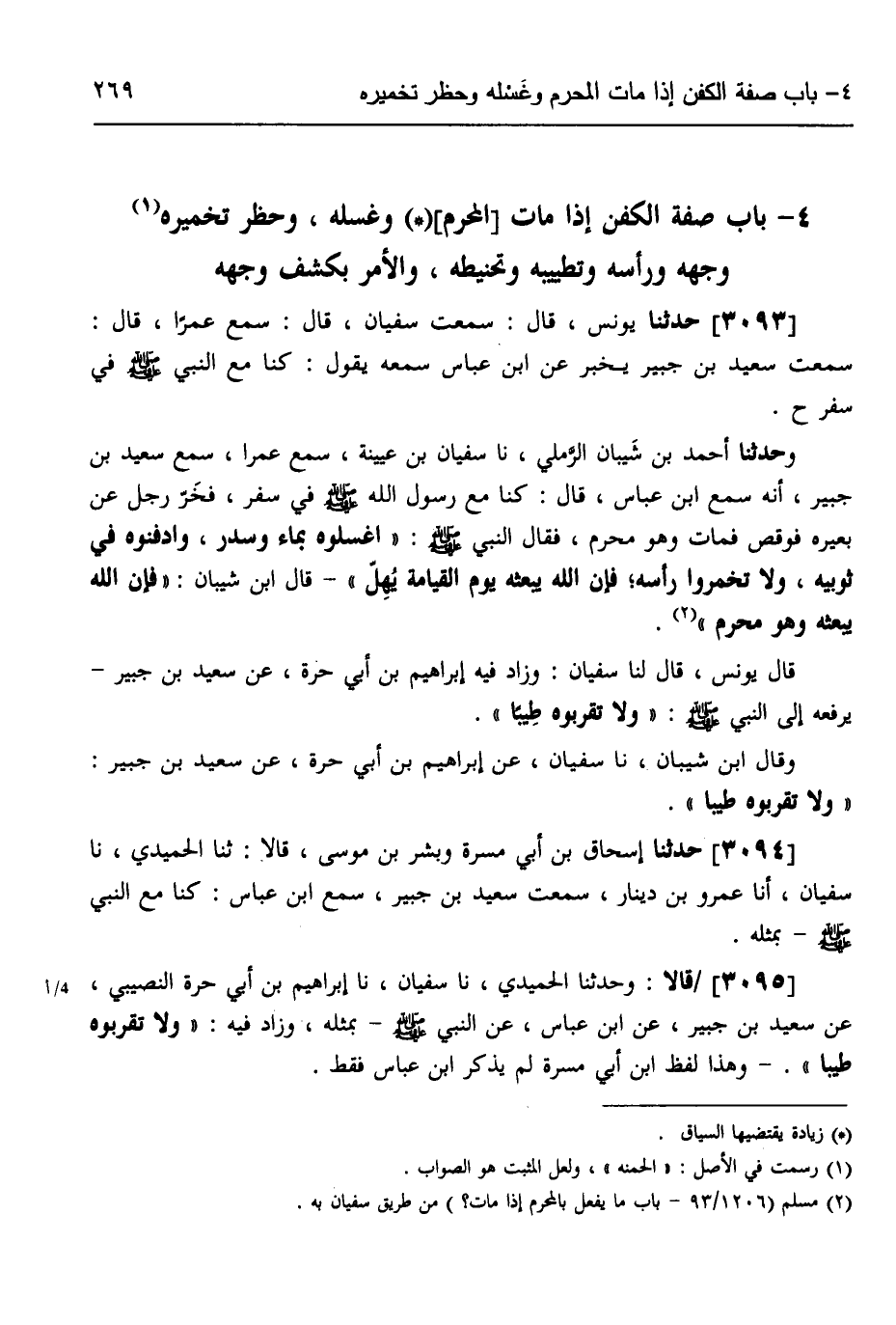 3093 - حَدَّثَنَا يُونُسُ، قَالَ: سَمِعْتُ سُفْيَانَ، قَالَ: سَمِعَ عَمْرًا، قَالَ: سَمِعْتُ سَعِيدَ بْنَ جُبَيْرٍ يُخْبِرُ، عَنِ ابْنِ عَبَّاسٍ، سَمِعَهُ يَقُولُ: كُنَّا مَعَ النَّبِيِّ صَلَّى اللهُ عَلَيْهِ وَسَلَّمَ فِي سَفَرٍ، ح وَحَدَّثَنَا أَحْمَدُ بْنُ شَيْبَانَ الرَّمْلِيُّ، نَا سُفْيَانُ بْنُ عُيَيْنَةَ، سَمِعَ عَمْرًا، سَمِعَ سَعِيدَ بْنَ جُبَيْرٍ، أَنَّهُ سَمِعَ ابْنَ عَبَّاسٍ قَالَ: كُنَّا مَعَ رَسُولِ اللَّهِ صَلَّى اللهُ عَلَيْهِ وَسَلَّمَ فِي سَفَرٍ فَخَرَّ رَجُلٌ عَنْ بَعِيرِهِ، فَوُقِصَ فَمَاتَ وَهُوَ مُحْرِمٌ، فَقَالَ النَّبِيُّ صَلَّى اللهُ عَلَيْهِ وَسَلَّمَ: «§اغْسِلُوهُ بِمَاءٍ وَسِدْرٍ، وَادْفِنُوهُ فِي ثَوْبَيْهِ، وَلَا تُخَمِّرُوا رَأْسَهُ، فَإِنَّ اللَّهَ يَبْعَثُهُ يَوْمَ الْقِيَامَةِ يُهِلُّ» قَالَ ابْنُ شَيْبَانَ: «فَإِنَّ اللَّهَ يَبْعَثُهُ وَهُوَ مُحْرِمٌ» قَالَ يُونُسُ: قَالَ لَنَا سُفْيَانُ، وَزَادَ فِيهِ إِبْرَاهِيمُ بْنُ أَبِي حُرَّةَ، عَنْ سَعِيدِ بْنِ جُبَيْرٍ يَرْفَعُهُ إِلَى النَّبِيِّ صَلَّى اللهُ عَلَيْهِ وَسَلَّمَ: «وَلَا تُقَرِّبُوهُ طِيبًا» وَقَالَ ابْنُ شَيْبَانَ: نَا سُفْيَانُ، عَنْ إِبْرَاهِيمَ بْنِ أَبِي حُرَّةَ، عَنْ سَعِيدِ بْنِ جُبَيْرٍ: «وَلَا تُقَرِّبُوهُ طِيبًا»