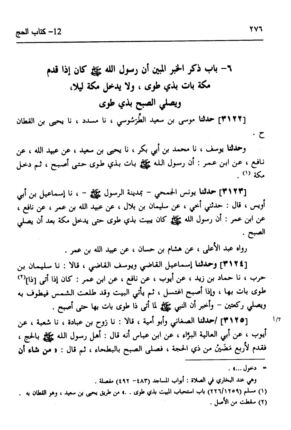 3122 - حَدَّثَنَا مُوسَى بْنُ سَعِيدٍ الطَّرَسُوسِيُّ، نَا مُسَدَّدٌ، نَا يَحْيَى بْنُ الْقَطَّانِ، ح وَحَدَّثَنَا يُوسُفُ، نَا مُحَمَّدُ بْنُ أَبِي بَكْرٍ، نَا يَحْيَى بْنُ سَعِيدٍ، عَنْ عُبَيْدِ اللَّهِ، عَنْ نَافِعٍ،، عَنِ ابْنِ عُمَرَ «أَنَّ رَسُولَ اللَّهِ صَلَّى اللهُ عَلَيْهِ وَسَلَّمَ §بَاتَ بِذِي طُوًى حَتَّى أَصْبَحَ، ثُمَّ دَخَلَ مَكَّةَ»