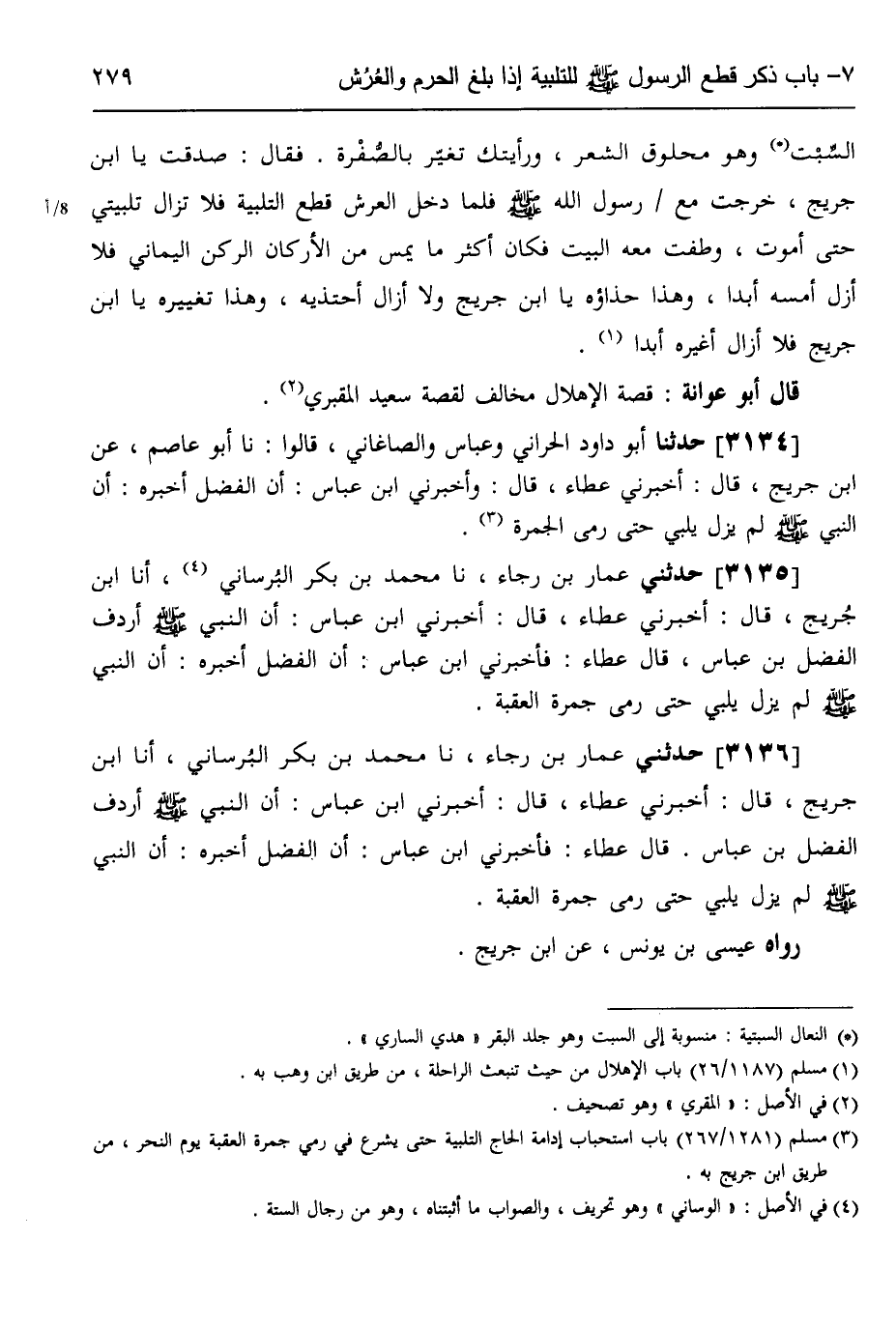 3134 - حَدَّثَنَا أَبُو دَاوُدَ الْحَرَّانِيُّ، وَعَبَّاسٌ، وَالصَّاغَانِيُّ، قَالُوا: نَا أَبُو عَاصِمٍ، عَنِ ابْنِ جُرَيْجٍ قَالَ: أَخْبَرَنِي عَطَاءٌ قَالَ: وَأَخْبَرَنِي ابْنُ عَبَّاسٍ أَنَّ الْفَضْلَ أَخْبَرَهُ «أَنَّ النَّبِيَّ صَلَّى اللهُ عَلَيْهِ وَسَلَّمَ §لَمْ يَزَلْ يُلَبِّي حَتَّى رَمَى الْجَمْرَةَ»