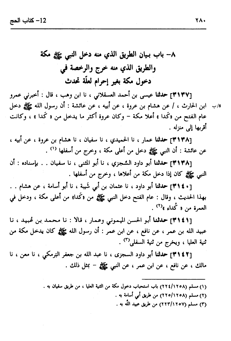 3138 - حَدَّثَنَا عَمَّارٌ، نَا الْحُمَيْدِيُّ، نَا سُفْيَانُ، نَا هِشَامُ بْنُ عُرْوَةَ، عَنْ أَبِيهِ،، عَنْ عَائِشَةَ «أَنَّ النَّبِيَّ صَلَّى اللهُ عَلَيْهِ وَسَلَّمَ §دَخَلَ مِنْ أَعْلَى مَكَّةَ وَخَرَجَ مِنْ أَسْفَلِهَا»