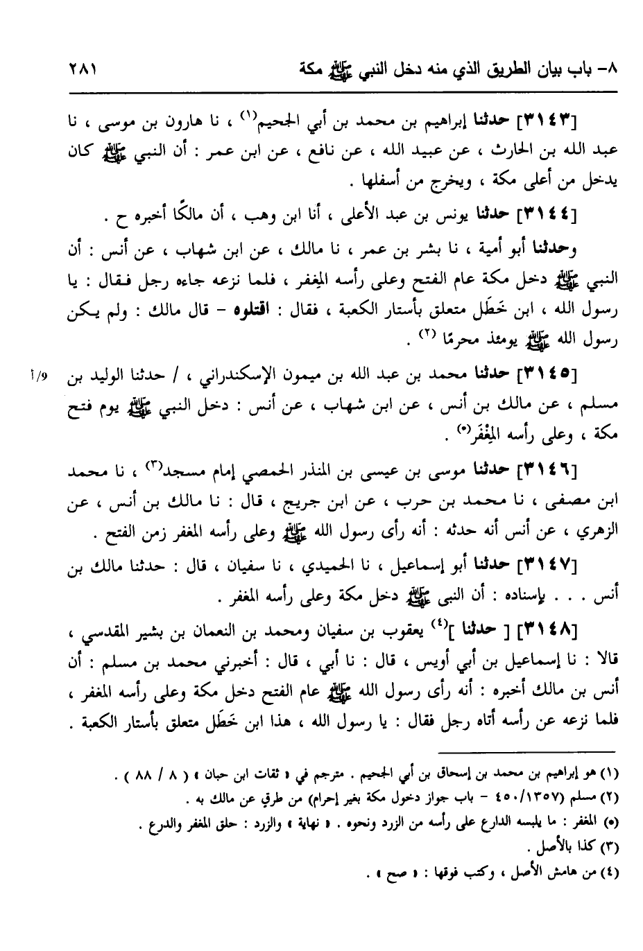 3145 - حَدَّثَنَا مُحَمَّدُ بْنُ عَبْدِ اللَّهِ بْنِ مَيْمُونٍ الْإِسْكَنْدَرَانِيُّ، حَدَّثَنَا الْوَلِيدُ بْنُ مُسْلِمٍ، عَنْ مَالِكِ بْنِ أَنَسٍ، عَنِ ابْنِ شِهَابٍ،، عَنْ أَنَسٍ، «§دَخَلَ النَّبِيُّ صَلَّى اللهُ عَلَيْهِ وَسَلَّمَ يَوْمَ فَتْحِ مَكَّةَ وَعَلَى رَأْسِهِ الْمِغْفَرُ»