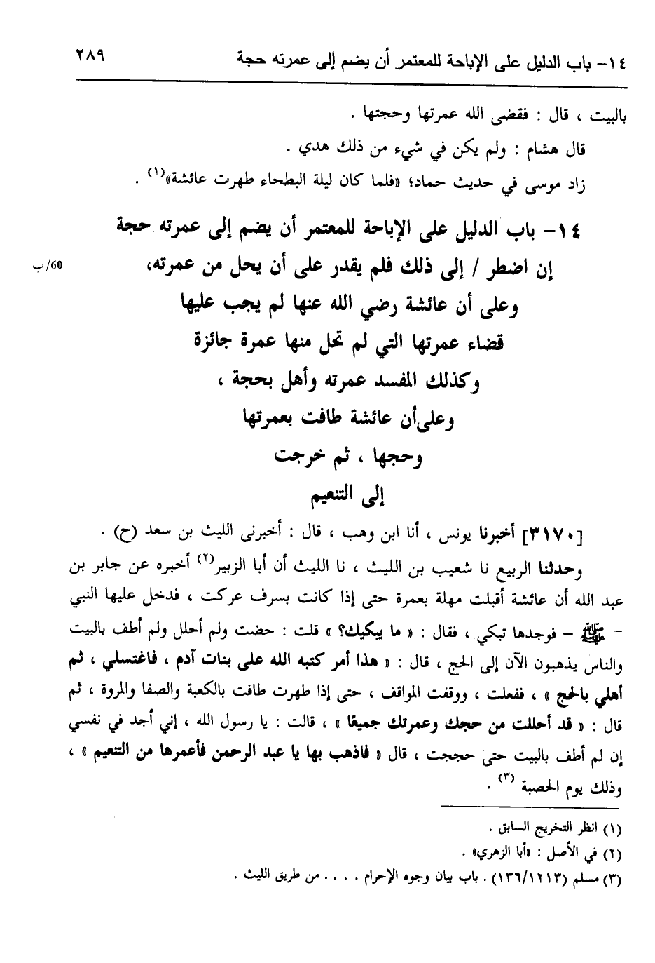 3170 - أَخْبَرَنَا يُونُسُ أَنَا ابْنَ وَهْبٍ قَالَ: أَخْبَرَنِي اللَّيْثُ بْنُ سَعْدٍ، ح وَحَدَّثَنَا الرَّبِيعُ، نَا شُعَيْبُ بْنُ اللَّيْثِ، نَا اللَّيْثُ، أَنَّ أَبَا الزُّبَيْرِ أَخْبَرَهُ، عَنْ جَابِرِ بْنِ عَبْدِ اللَّهِ، أَنَّ عَائِشَةَ أَقْبَلَتْ مُهِلَّةً بِعُمْرَةٍ حَتَّى إِذَا كَانَتْ بِسَرِفَ عَرَكَتْ، فَدَخَلَ عَلَيْهَا النَّبِيُّ صَلَّى اللهُ عَلَيْهِ وَسَلَّمَ فَوَجَدَهَا تَبْكِي فَقَالَ: «مَا يُبْكِيكِ؟» قُلْتُ: حِضْتُ وَلَمْ أَحْلِلْ وَلَمْ أَطُفْ بِالْبَيْتِ، وَالنَّاسُ يَذْهَبُونَ الْآنَ إِلَى الْحَجِّ، قَالَ: «§هَذَا أَمْرٌ كَتَبَهُ اللَّهُ عَلَى بَنَاتِ آدَمَ، فَاغْتَسِلِي ثُمَّ أَهَلِّي بِالْحَجِّ» فَفَعَلْتُ وَوَقَفْتُ الْمَوَاقِفَ حَتَّى إِذَا طَهُرْتُ طُفْتُ بِالْكَعْبَةِ وَالصَّفَا وَالْمَرْوَةِ، ثُمَّ قَالَ: «قَدْ أَحْلَلْتِ مِنْ حَجِّكِ وَعُمْرَتِكِ جَمِيعًا» قَالَتْ: يَا رَسُولَ اللَّهِ، إِنِّي أَجِدُ فِي نَفْسِي إِنْ لَمْ أَطُفْ بِالْبَيْتِ حَتَّى حَجَجْتُ، قَالَ: «فَاذْهَبْ بِهَا يَا عَبْدَ الرَّحْمَنِ، فَأَعْمِرْهَا مِنَ التَّنْعِيمِ» وَذَلِكَ يَوْمَ الْحَصْبَةِ