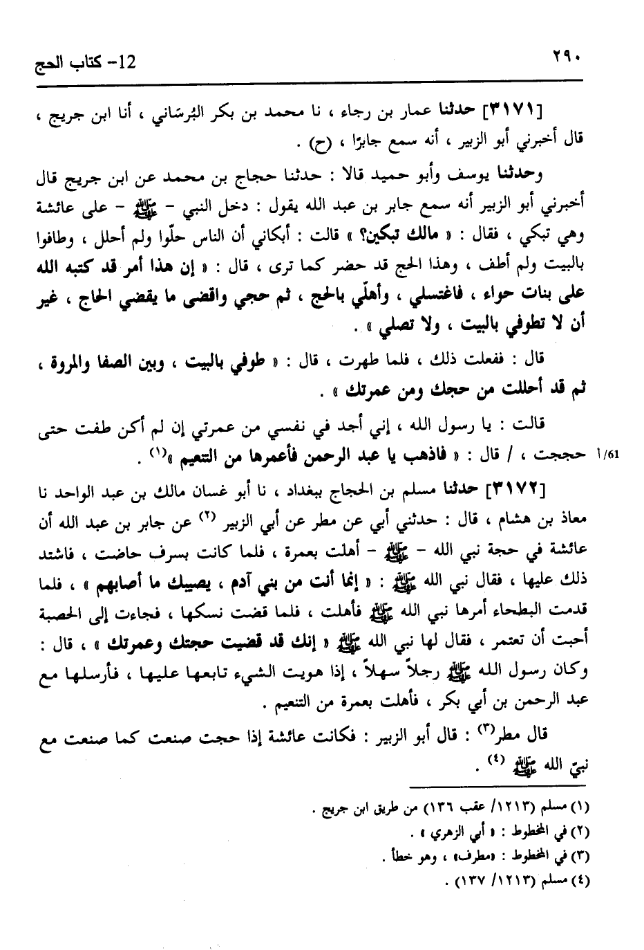 3171 - حَدَّثَنَا عَمَّارُ بْنُ رَجَاءٍ، نَا مُحَمَّدُ بْنُ بَكْرٍ الْبُرْسَانِيُّ، أَنَا ابْنُ جُرَيْجٍ، قَالَ: أَخْبَرَنِي أَبُو الزُّبَيْرِ أَنَّهُ سَمِعَ جَابِرًا، ح وَحَدَّثَنَا يُوسُفُ، وَأَبُو حُمَيْدٍ، قَالَا: حَدَّثَنَا حَجَّاجُ بْنُ مُحَمَّدٍ، عَنِ ابْنِ جُرَيْجٍ قَالَ: أَخْبَرَنِي أَبُو الزُّبَيْرِ أَنَّهُ سَمِعَ جَابِرَ بْنَ عَبْدِ اللَّهِ يَقُولُ: دَخَلَ النَّبِيُّ صَلَّى اللهُ عَلَيْهِ وَسَلَّمَ عَلَى عَائِشَةَ وَهِيَ تَبْكِي فَقَالَ: «مَالَكِ تَبْكِينَ؟» قَالَتْ: أَبْكَانِي أَنَّ النَّاسَ حَلُّوا وَلَمْ أَحْلِلْ، وَطَافُوا بِالْبَيْتِ وَلَمْ أَطُفْ، وَهَذَا الْحَجُّ قَدْ حَضَرَ كَمَا تَرَى، قَالَ: «إِنَّ §هَذَا أَمْرٌ قَدْ كَتَبَهُ اللَّهُ عَلَى بَنَاتِ حَوَّاءَ، فَاغْتَسِلِي وَأَهِلِّي بِالْحَجِّ، ثُمَّ حُجِّي وَاقْضِي مَا يَقْضِي الْحَاجُّ غَيْرَ أَنْ لَا تَطُوفِي بِالْبَيْتِ وَلَا تُصَلِّي» قَالَ: فَفَعَلَتْ ذَلِكَ فَلَمَّا طَهُرَتْ، قَالَ: «طُوفِي بِالْبَيْتِ وَبَيْنَ الصَّفَا وَالْمَرْوَةِ، ثُمَّ قَدْ أَحْلَلْتِ مِنْ حَجِّكِ وَمِنْ عُمْرَتِكِ» قَالَتْ: يَا رَسُولَ اللَّهِ، إِنِّي أَجِدُ فِي نَفْسِي مِنْ عُمْرَتِي إِنْ لَمْ أَكُنْ طُفْتُ حَتَّى حَجَجْتُ، قَالَ: «فَاذْهَبْ يَا عَبْدَ الرَّحْمَنِ فَأَعْمِرْهَا مِنَ التَّنْعِيمِ»