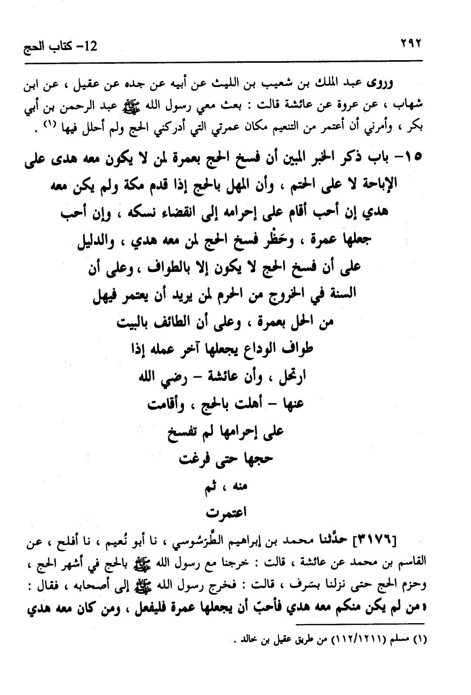 3176 - حَدَّثَنَا مُحَمَّدُ بْنُ إِبْرَاهِيمَ الطَّرَسُوسِيُّ، نَا أَبُو نُعَيْمٍ، نَا أَفْلَحُ، عَنِ الْقَاسِمِ بْنِ مُحَمَّدٍ،، عَنْ عَائِشَةَ قَالَتْ: خَرَجْنَا مَعَ رَسُولِ اللَّهِ صَلَّى اللهُ عَلَيْهِ وَسَلَّمَ بِالْحَجِّ فِي أَشْهُرِ الْحَجِّ وَحَزَمَ الْحَجَّ، حَتَّى نَزَلْنَا بِسَرِفَ قَالَتْ: فَخَرَجَ رَسُولُ اللَّهِ صَلَّى اللهُ عَلَيْهِ وَسَلَّمَ إِلَى أَصْحَابِهِ فَقَالَ: «§مَنْ لَمْ يَكُنُ مِنْكُمْ مَعَهُ هَدْيٌ فَأَحَبَّ أَنْ يَجْعَلَهَا عُمْرَةً فَلْيَفْعَلْ، وَمَنْ كَانَ مَعَهُ هَدْيٌ فَلَا» -[293]- وَكَانَ مَعَ رَسُولِ اللَّهِ صَلَّى اللهُ عَلَيْهِ وَسَلَّمَ هَدْيٌ وَمَعَ رِجَالٍ مِنْ أَصْحَابِهِ ذَوِي قُوَّةٍ كَانَ مَعَهُمُ الْهَدْيُ، قَالَتْ: فَالْآخِذُ بِالْأُولَى مَنْ لَمْ يَكُنْ مَعَهُ الْهَدْيُ، وَالتَّارِكُ لَهَا، قَالَتْ: فَدَخَلَ رَسُولُ اللَّهِ صَلَّى اللهُ عَلَيْهِ وَسَلَّمَ وَأَنَا أَبْكِي فَقَالَ: «مَا يُبْكِيكِ؟» قَالَتْ: سَمِعْتُ قَوْلَكَ لِأَصْحَابِكَ فَمُنِعْتُ الْعُمْرَةَ، قَالَ: «وَمَا شَأْنُكِ؟» قُلْتُ: لَا أُصَلِّي، قَالَ: «لَا يَضُرُّكِ إِنَّمَا أَنْتِ مِنْ بَنَاتِ آدَمَ كَتَبَ اللَّهُ عَلَيْكِ مَا كَتَبَ عَلَيْهِنَّ، فَكُونِي فِي حَجَّتِكِ فَعَسَى اللَّهُ أَنْ يَرْزُقَكِهَا» قَالَتْ: فَكُنْتُ فِي حَجَّتِي حَتَّى نَفَرْنَا مِنْ مِنًى، فَنَزَلَ الْمُحَصَّبَ فَدَعَا عَبْدَ الرَّحْمَنِ بْنَ أَبِي بَكْرٍ فَقَالَ: «اخْرُجْ بِأُخْتِكَ مِنَ الْحَرَمِ فَلْتُهِلَّ بِعُمْرَةٍ، ثُمَّ افْرُغَا مِنْ طَوَافِكُمَا فَإِنِّي أَنْتَظِرُكُمَا هَاهُنَا حَتَّى تَأْتِيَا» قَالَ: فَجِئْنَاهُ فِي جَوْفِ اللَّيْلِ، قَالَ: «قَدْ فَرَغْتُمَا» قُلْتُ: نَعَمْ، فَنَادَى بِالرَّحِيلِ فِي أَصْحَابِهِ، فَارْتَحَلَ النَّاسُ وَمَرَّ بِالْبَيْتِ فَطَافَ قَبْلَ صَلَاةِ الصُّبْحِ، ثُمَّ خَرَجَ مُتَوَجِّهًا إِلَى الْمَدِينَةِ