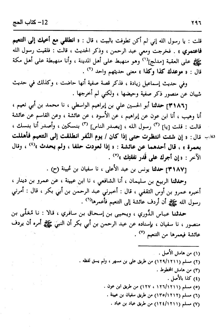 3186 - حَدَّثَنَا أَبُو الْحُسَيْنِ عَلِيُّ بْنُ إِبْرَاهِيمَ الْوَاسِطِيُّ، نَا مُحَمَّدُ بْنُ أَبِي نُعَيْمٍ، أَنَا وُهَيْبٌ، أَنَا ابْنُ عَوْنٍ، عَنْ إِبْرَاهِيمَ، عَنِ الْأَسْوَدِ، عَنْ عَائِشَةَ، وَعَنِ الْقَاسِمِ،، عَنْ عَائِشَةَ قَالَتْ: قُلْتُ: يَا رَسُولَ اللَّهِ، يَصْدُرُ النَّاسُ بِنُسُكَيْنِ وَأَصْدُرُ أَنَا بِنُسُكٍ، قَالَ: «§إِنْ شِئْتِ انْتَظَرْتِ حَتَّى إِذَا كَانَ يَوْمُ النَّفْرِ انْطَلَقْتِ إِلَى التَّنْعِيمِ فَأَهْلَلْتِ بِعُمْرَةٍ» قَالَ: أَحَدُهُمَا عَنْ عَائِشَةَ: «إِذًا لَعُوِّدْتِ حِلْفًا، وَلَمْ يَحْدُثْ» وَقَالَ الْآخَرُ: «إِنَّ أَجْرَكِ عَلَى قَدْرِ نَفَقَتِكِ»
